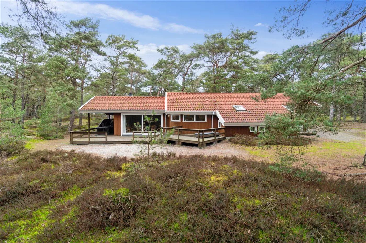 På stor naturgrund ud til fredet og lyngklædt naturområde ligger dette store luksushus, hvor man både kan nyde omgivelserne, de ugenerede terrasser og afslutte dagen med wellness i såvel sauna som i spa'en. Fyrretræesgulvene og de hvidpigmenterede vægge og lofter, der går op i kip, giver et godt indeklima, og man kan i fred og ro nyde tilværelsen i familiens skød. De to badeværelser er suppleret med et lille gæstetoilet, og det åbne køkken ligger direkte i forbindelse med den niveaudelte stue, der giver de bedste muligheder for at nyde en lækker frokost, nyde et TV-program eller blot slappe af med en god bog.