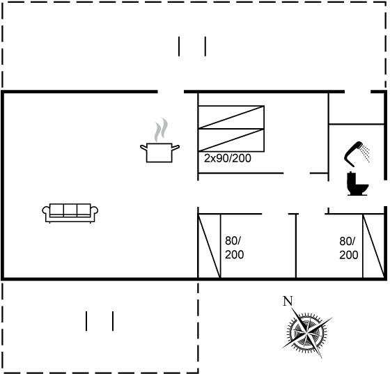 Der findes 3 soveværelser og et badeværelse med adgang både ind fra huset, men også fra terrassen, så man kan skylle sandet af fødderne efter en hel dag på stranden, inden man går indenfor. Det eneste der forstyrrer freden, når man nyder skønne timer på terrassen, er fuglefløjt og fuglekvidder.