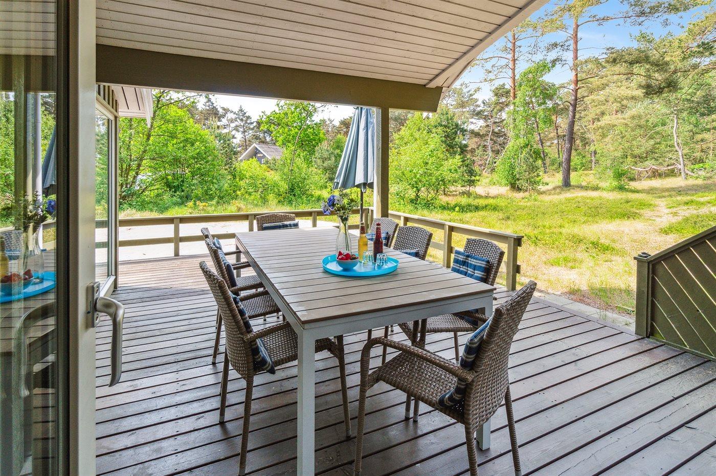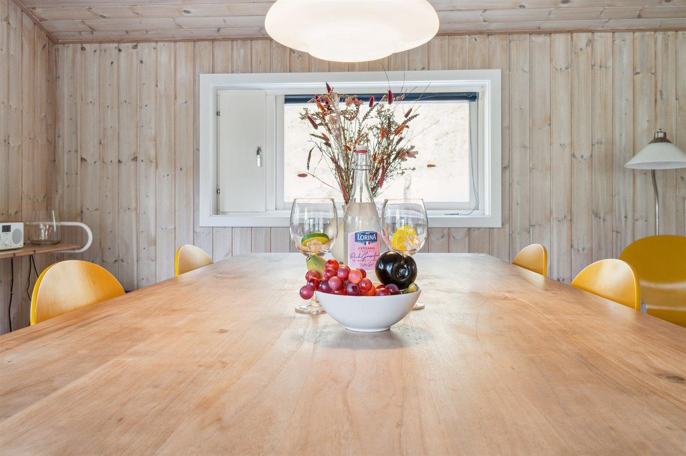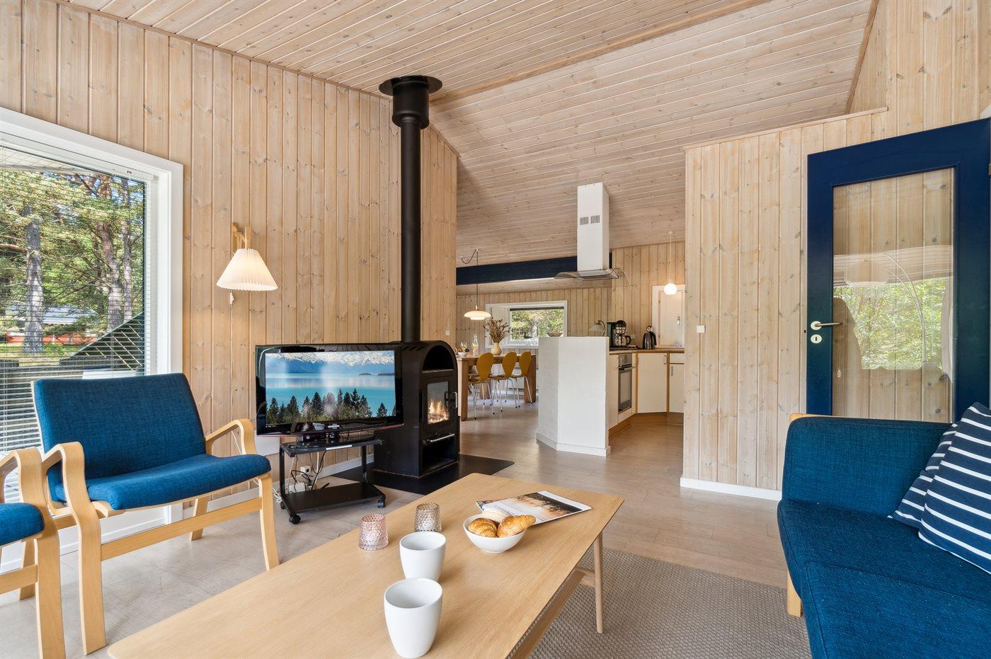 Husets hjerte er stuen, der er godt møbleret med kvalitetsmøbler - lyse gulve, vægge og lofter giver indemiljøet en behagelig fornemmelse. Veludstyret køkken med spiseafdelingen tæt på, så serveringen kan foregå let, når familien samles. Alt i alt byder huset på en god og ubekymret ferieoplevelse - der både kan foregå indendørs, hvis vejret er til det, og ellers på de store træterrasser, der er delvis overdækket. Den flotte sandstrand ved Jomfrugård indbyder til en badetur eller blot at nyde solen i de smukke omgivelser.