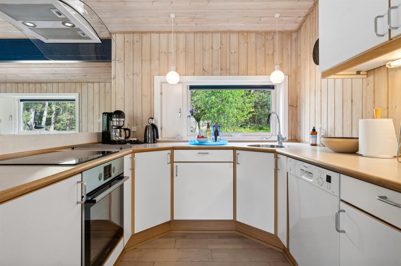 Køkkenet er udstyret med 1 køleskab. Der er 4 keramiske kogeplader, varmluftovn, mikrobølgeovn samt opvaskemaskine.