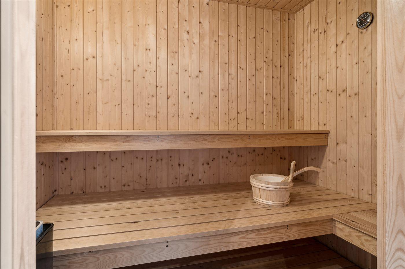 Der er 2 badeværelser med bruseniche og 2 toiletter, heraf 1 gæstetoilet. Der er gulvvarme på 2 badeværelser. Der er gulvvarme på gæstetoilettet. I saunaen er der mulighed for afslapning.