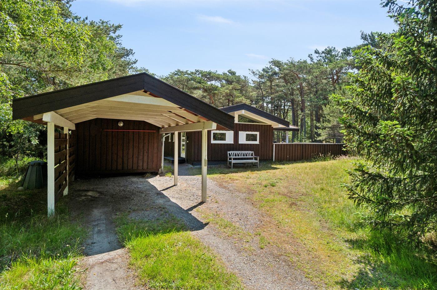 Bilen kan parkeres i en carport ved huset, og der er gode lade muligheder til elbiler i området.