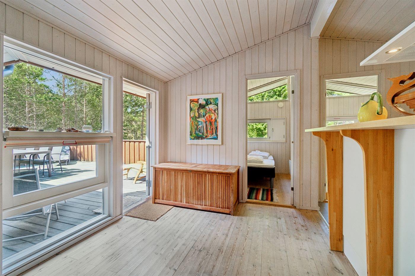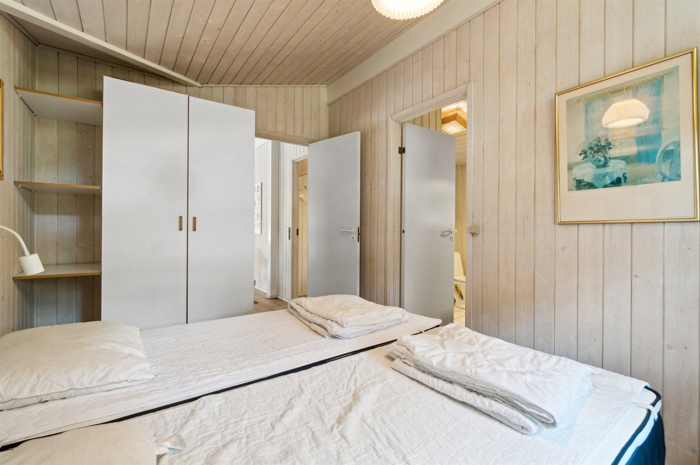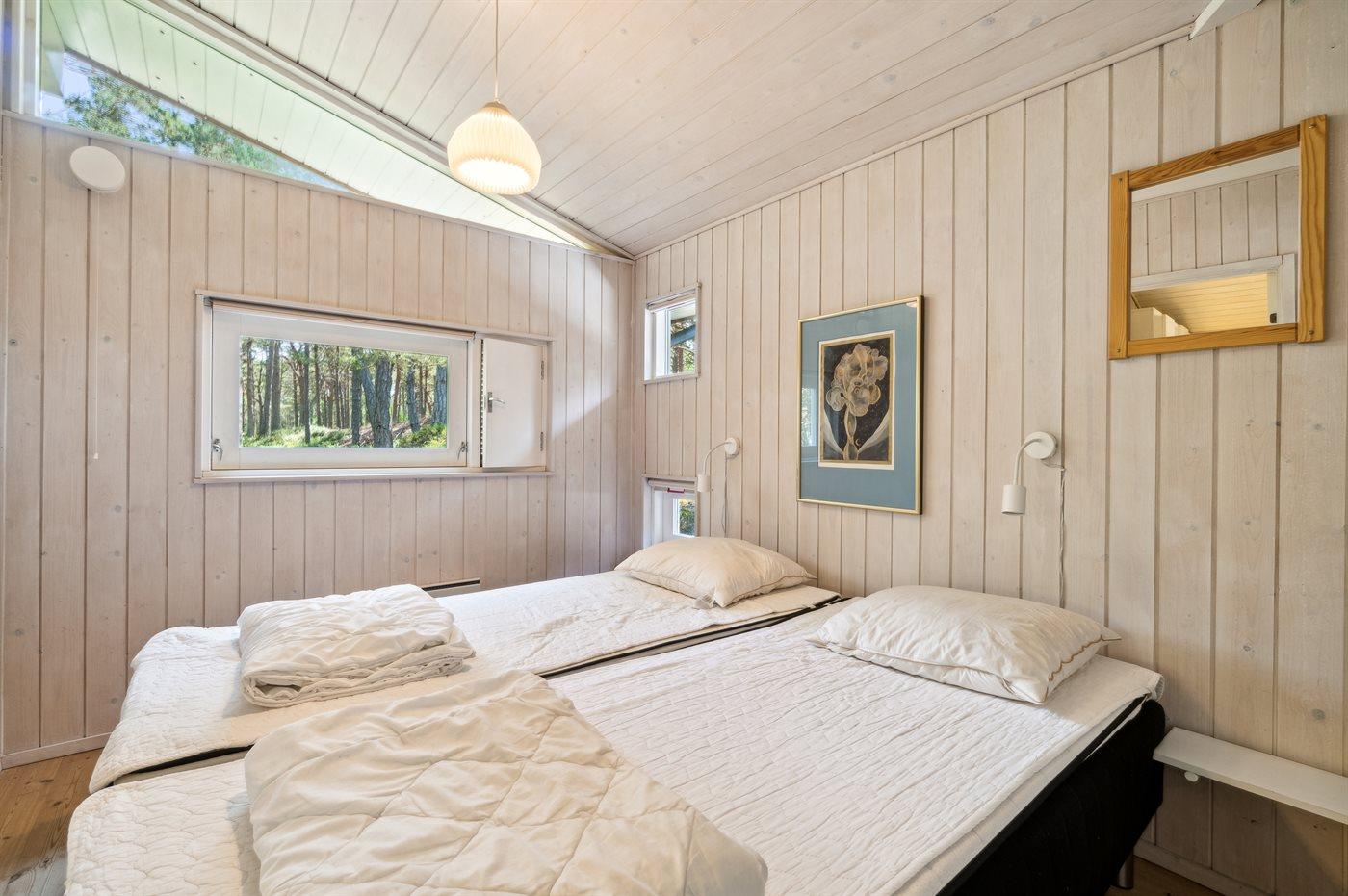Sommerhuset har 3 soveværelser; 2 med gode, moderne dobbeltsenge og 1 med køjeseng. Badeværelset er fint med bruseniche og sauna. Der er bryggers med vaskemaskine.