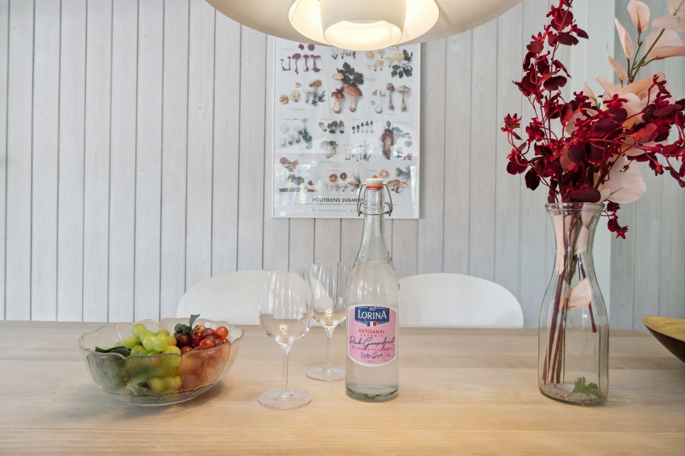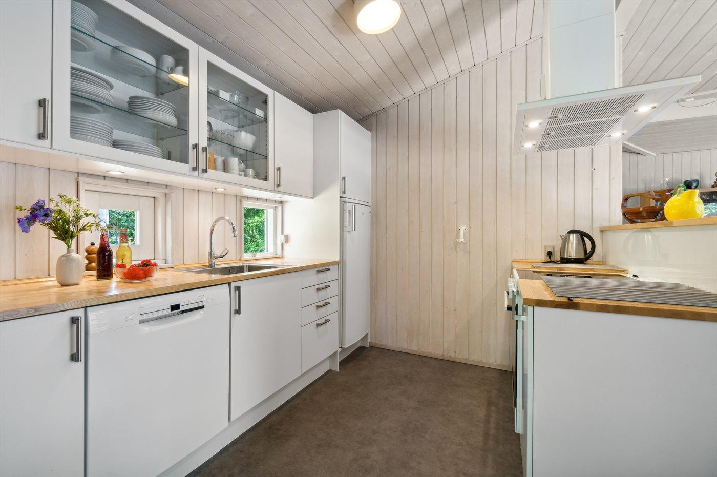 Køkkenet er udstyret med 1 køleskab. Der er 4 keramiske kogeplader, varmluftovn samt opvaskemaskine.