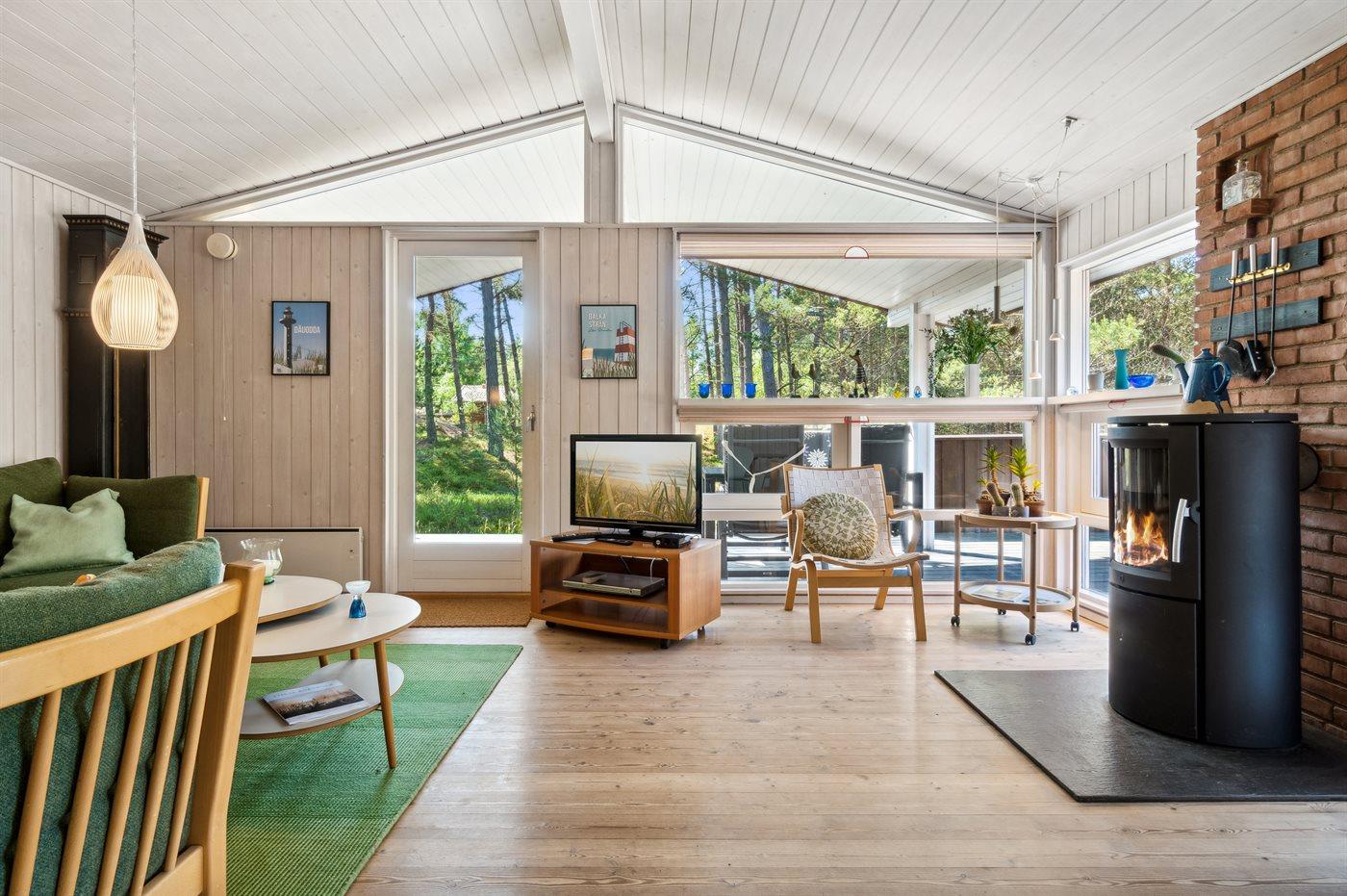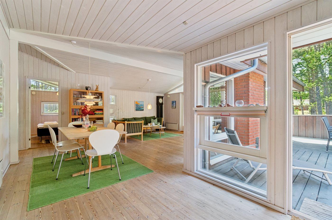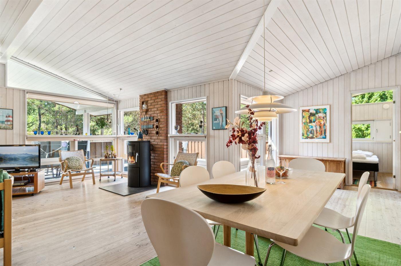 Huset er godt indrettet med bl.a. en stor lys stue med vinduer, som går til kip og giver frit udsyn til skoven. Indtrykket forstærkes af de lyse trævægge og den hyggelige indretning med bl.a. brændeovn. Sammen med stuen ligger spisepladsen, som har adgang til det åbne, moderne køkken med helt nye hvidevarer fra 2024.