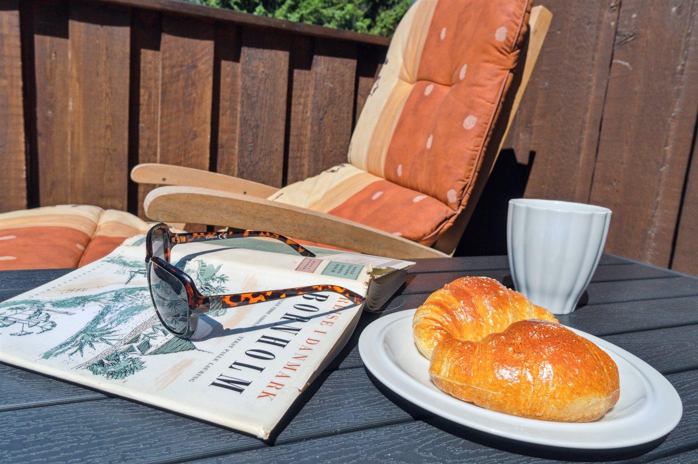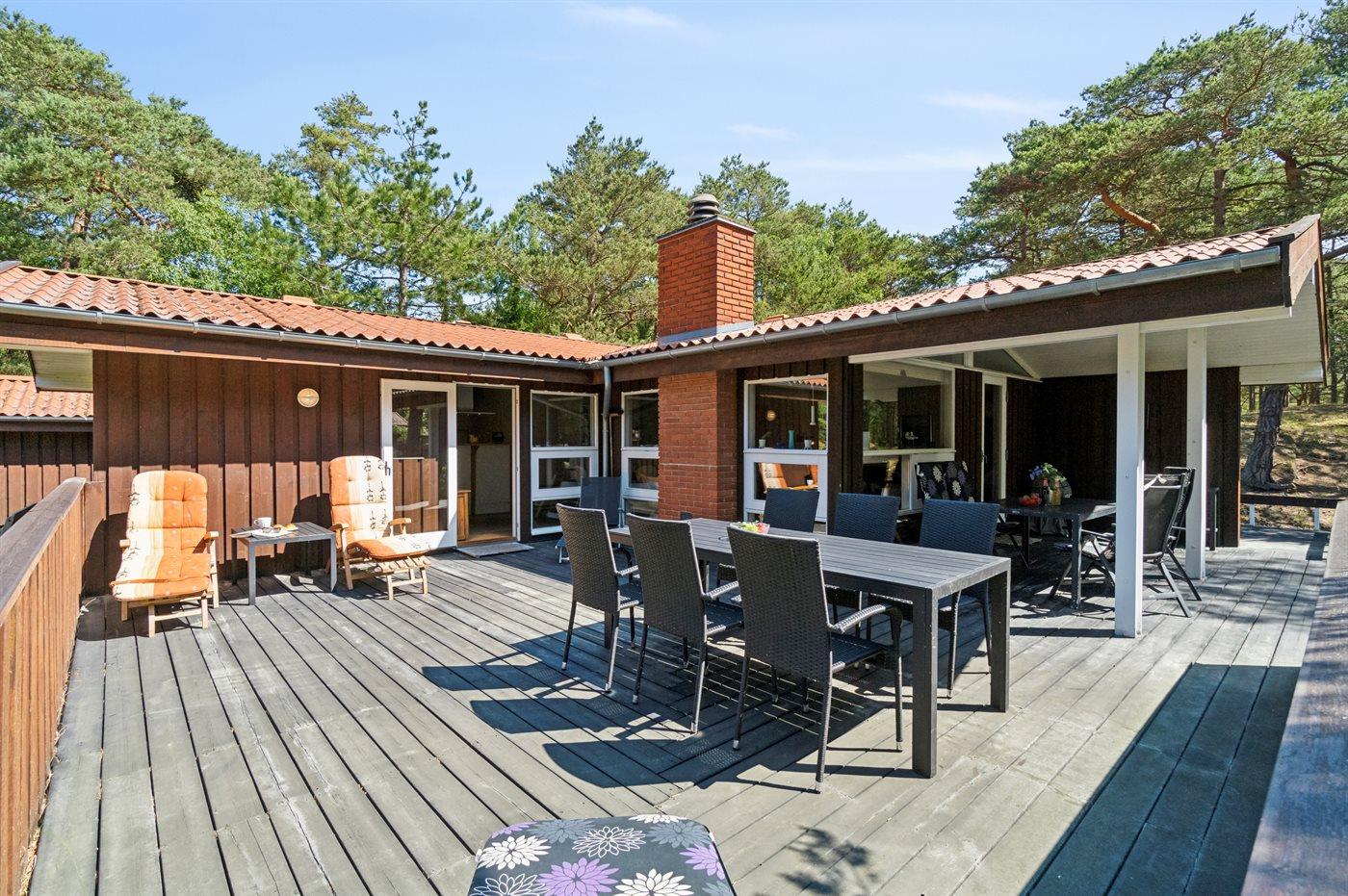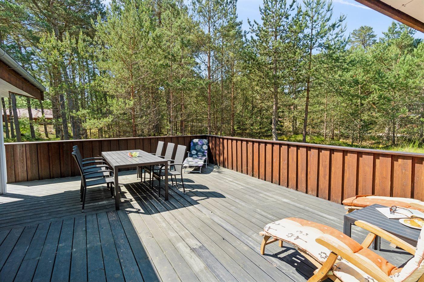 Fra stue og køkken er der direkte udgang til den store og delvist overdækkede træterrasse. med mange gode havemøbler og kulgrill.