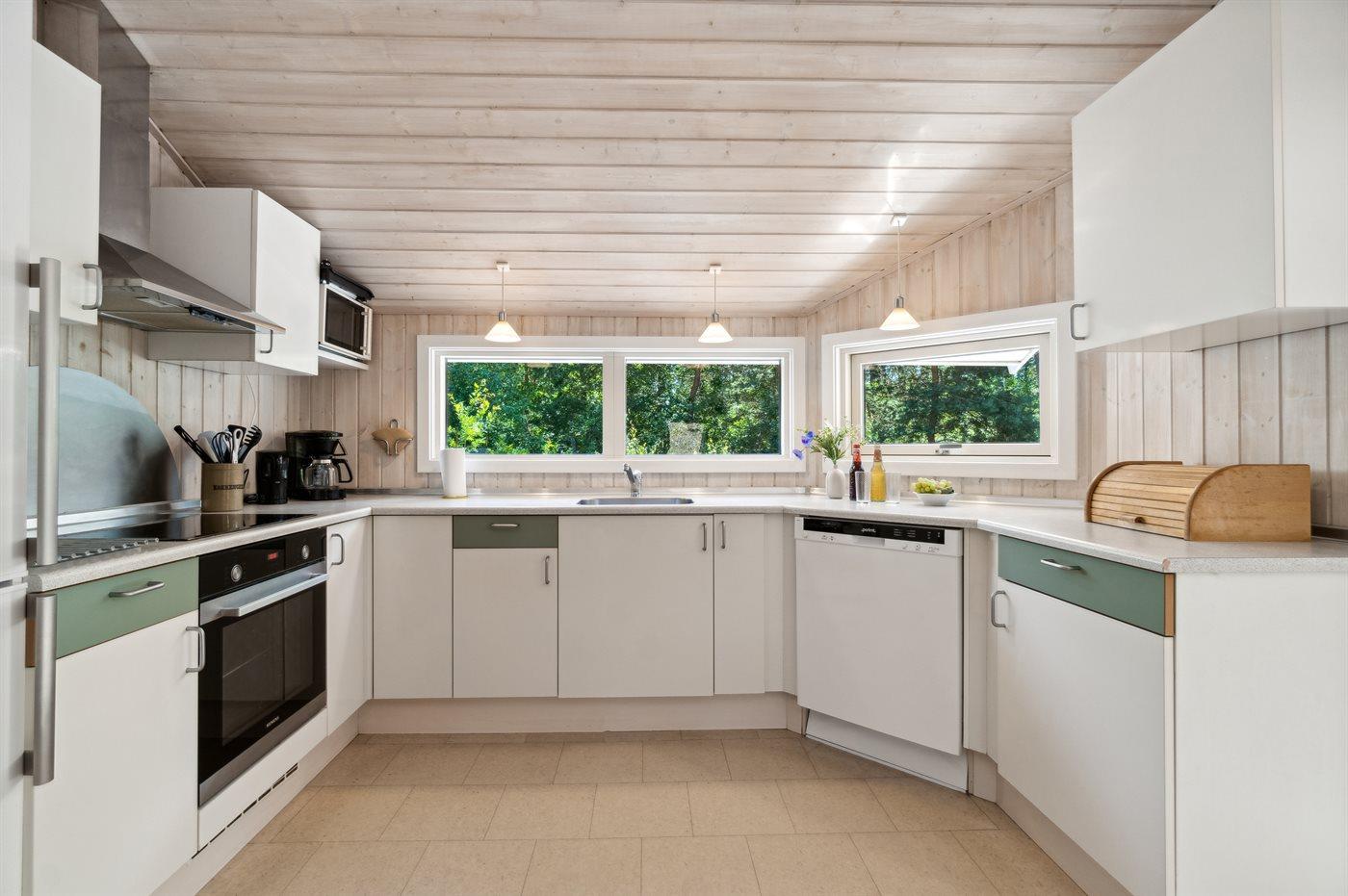 Køkkenet er udstyret med 1 køleskab. Der er 4 induktionskogeplader, varmluftovn, mikrobølgeovn samt opvaskemaskine.