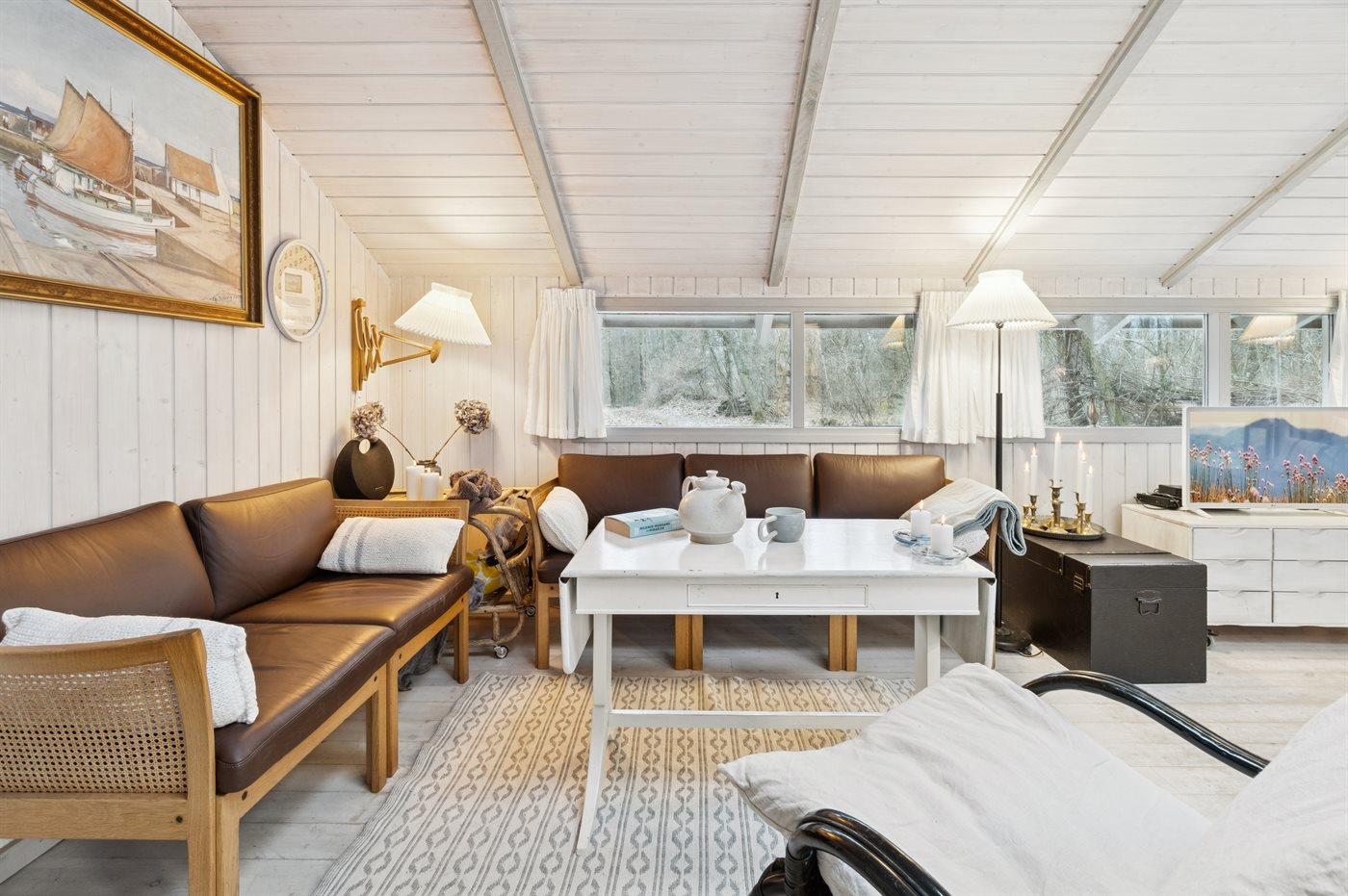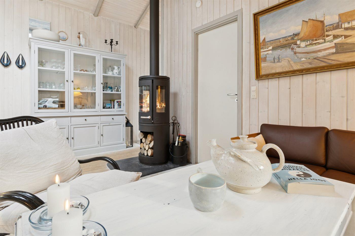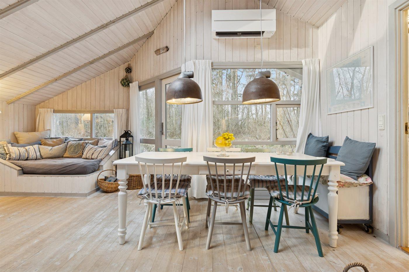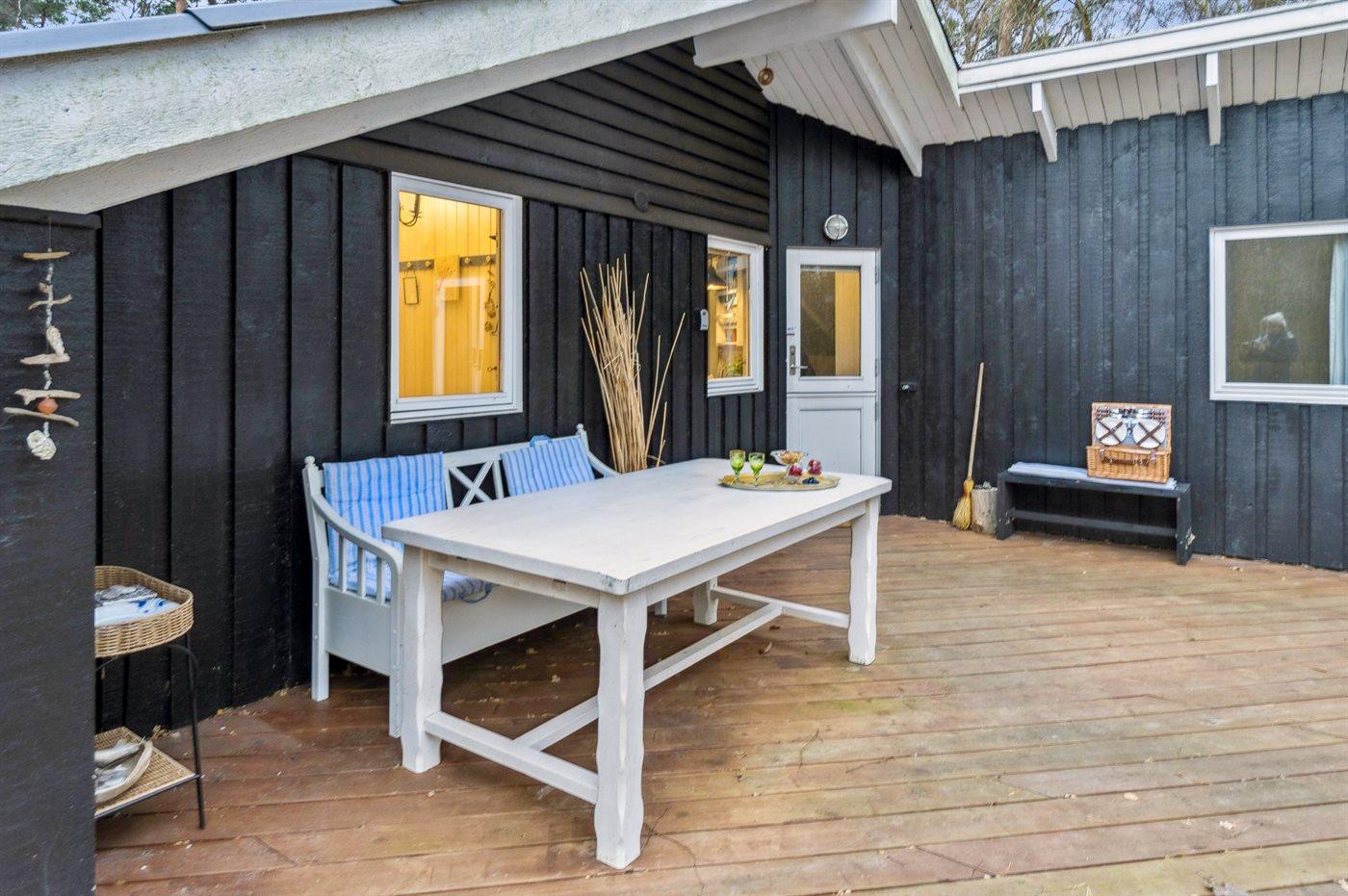 Huset byder på en større delvist overdækket træterrasse, så man kan nyde naturen, vejret og freden og roen i dette sommerhusområde. Især de store ovenlysvinduer giver et lyst interiør i stuen og køkkenet, så man virkelig kan nyde det velmøblerede feriehus, hvor der er gjort meget for, at der skal være en rød tråd i den samlede oplevelse af huset.