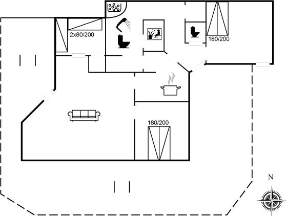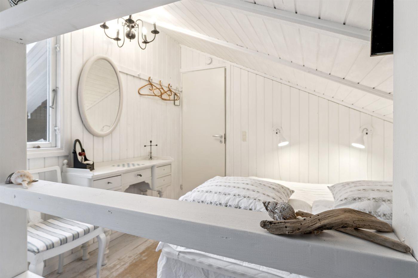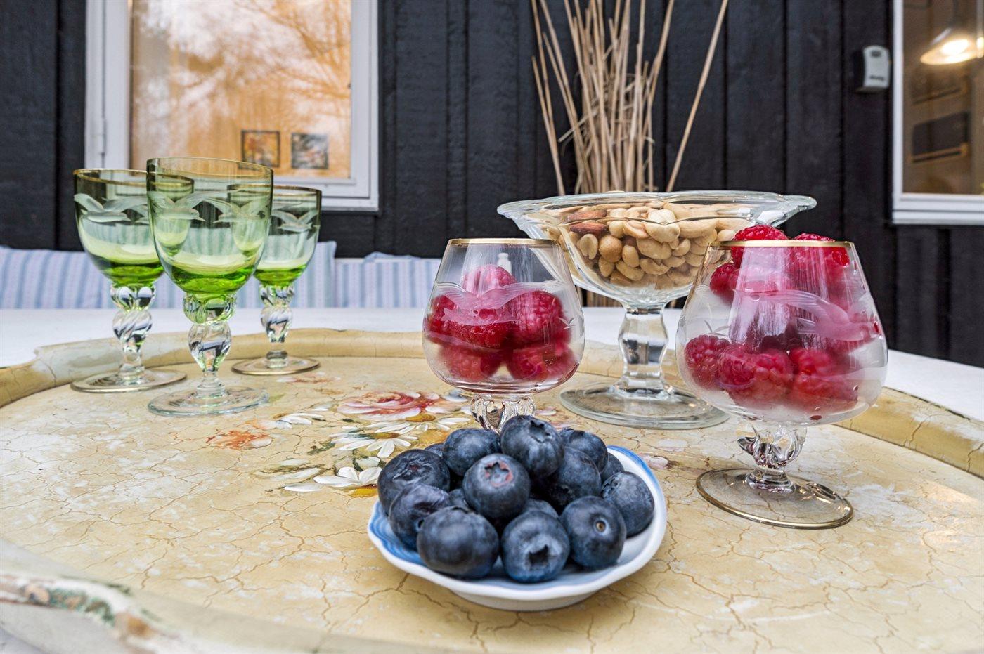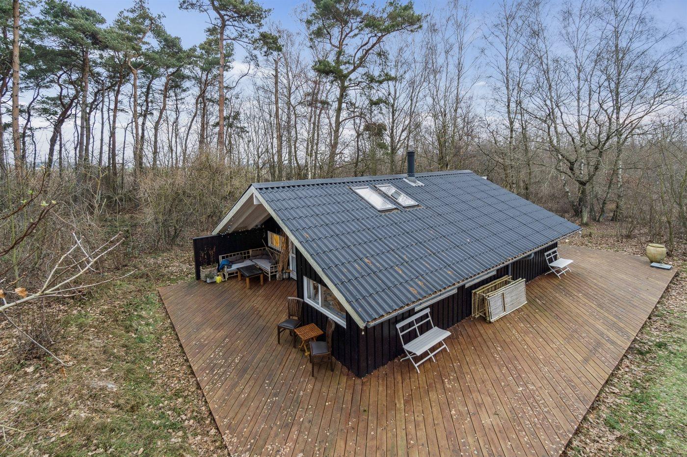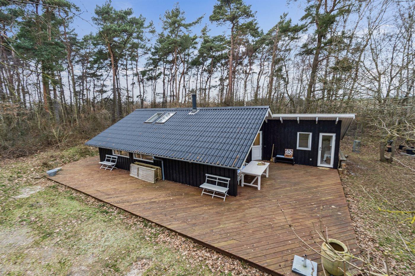 Huset byder på en større delvist overdækket træterrasse, så man kan nyde naturen, vejret og freden og roen i dette sommerhusområde. Især de store ovenlysvinduer giver et lyst interiør i stuen og køkkenet, så man virkelig kan nyde det velmøblerede feriehus, hvor der er gjort meget for, at der skal være en rød tråd i den samlede oplevelse af huset.
