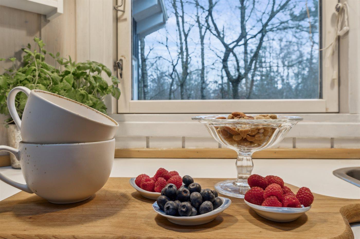 Køkkenet er udstyret med 1 køleskab. Der er 4 keramiske kogeplader, varmluftovn, mikrobølgeovn samt opvaskemaskine.
