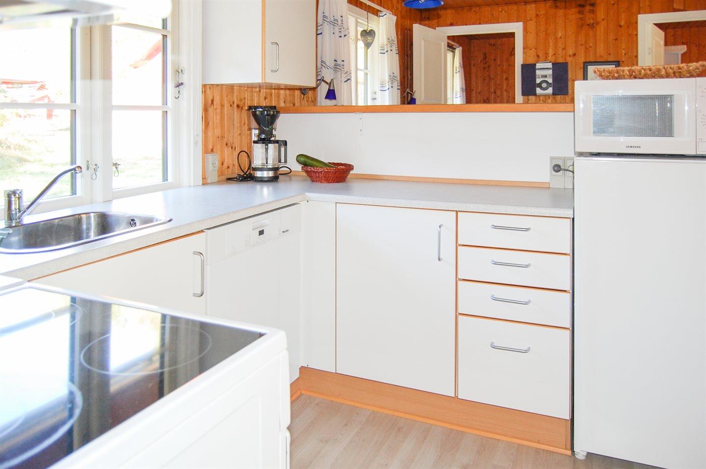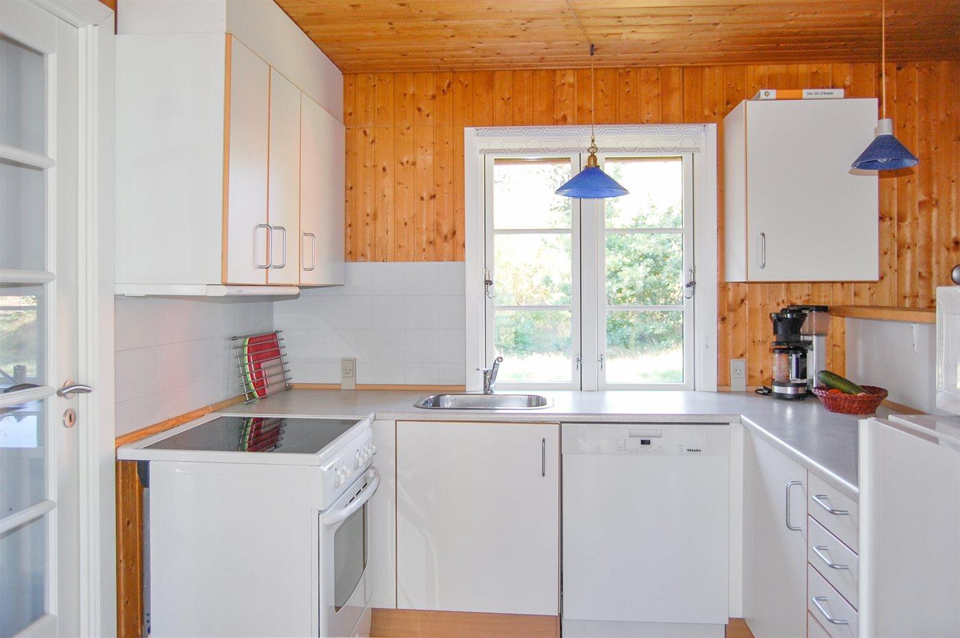 Køkkenet er udstyret med 1 køleskab. Der er 4 elkogeplader, varmluftovn, mikrobølgeovn samt opvaskemaskine.