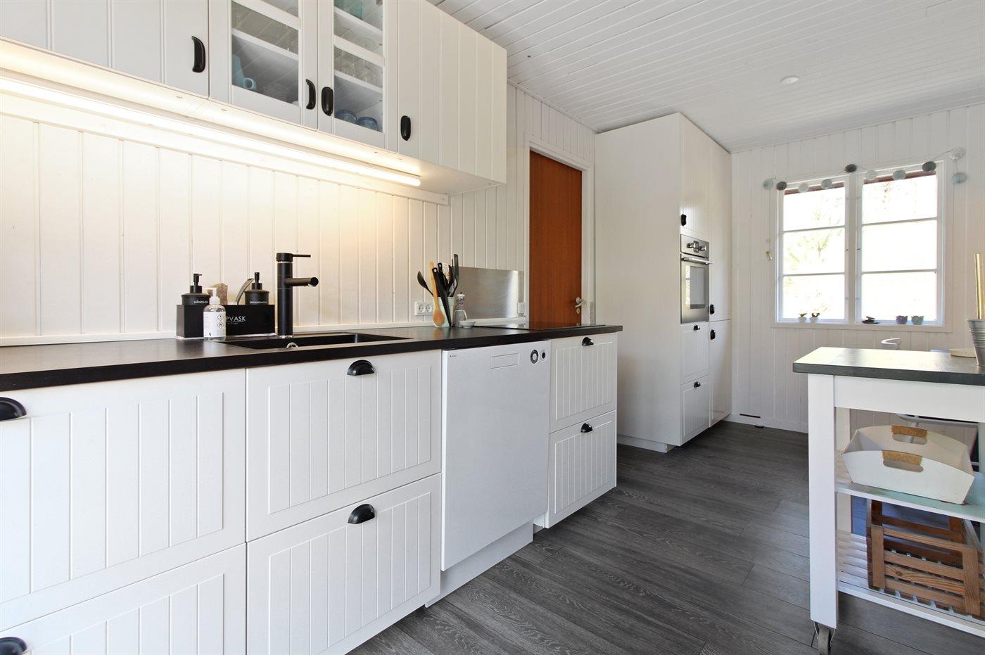 Køkkenet er udstyret med 1 køleskab. Der er 4 induktionskogeplader, varmluftovn samt opvaskemaskine.