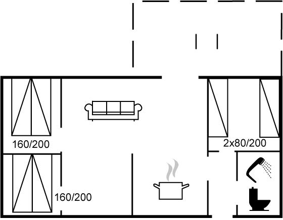 Der er i alt 3 soveværelser. Sovepladserne fordeler sig på: 4 sovepladser i dobbeltsenge. 2 sovepladser i enkeltsenge.