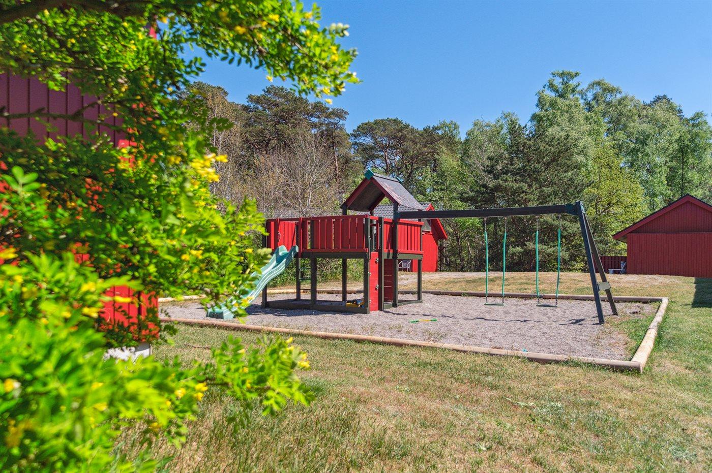 I området findes gynge, rutsjebane og sandkasse samt mulighed for at spille fodbold, basketball og petanque. Den store naturgrund mellem husene giver rig mulighed for leg. Huset ligger bag den lille vold tæt på fælleshuset.