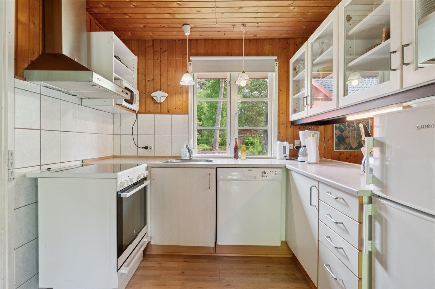 Køkkenet er udstyret med 1 køleskab. Der er 4 elkogeplader, bageovn, mikrobølgeovn samt opvaskemaskine.