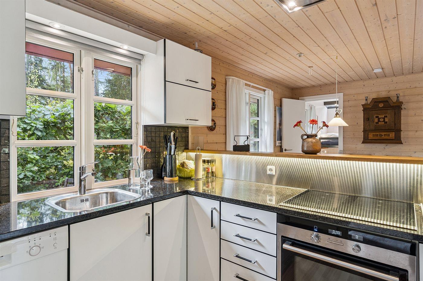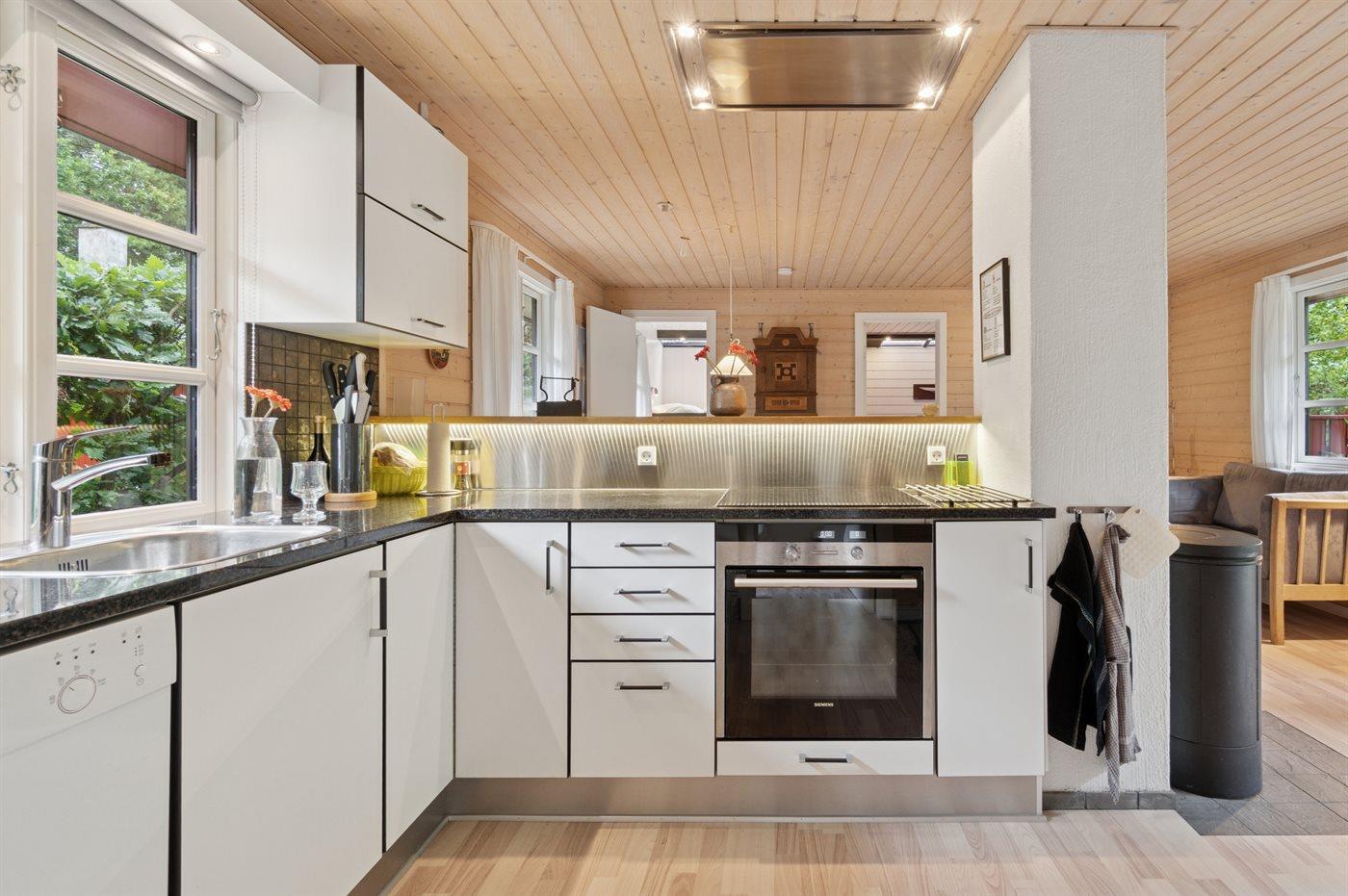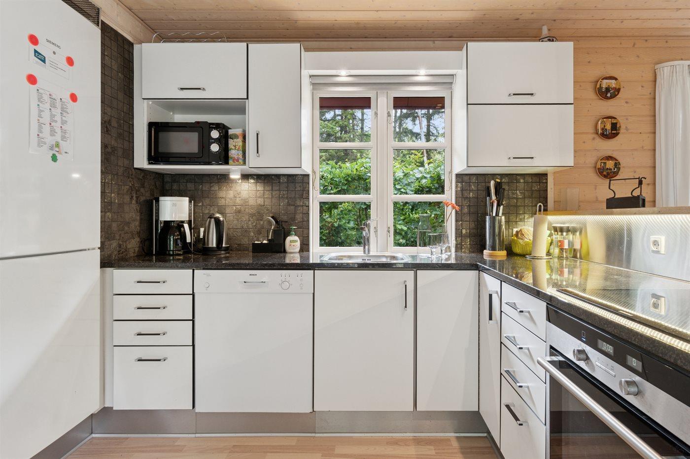 Køkkenet er udstyret med 1 køleskab. Der er 4 induktionskogeplader, varmluftovn, mikrobølgeovn samt opvaskemaskine.