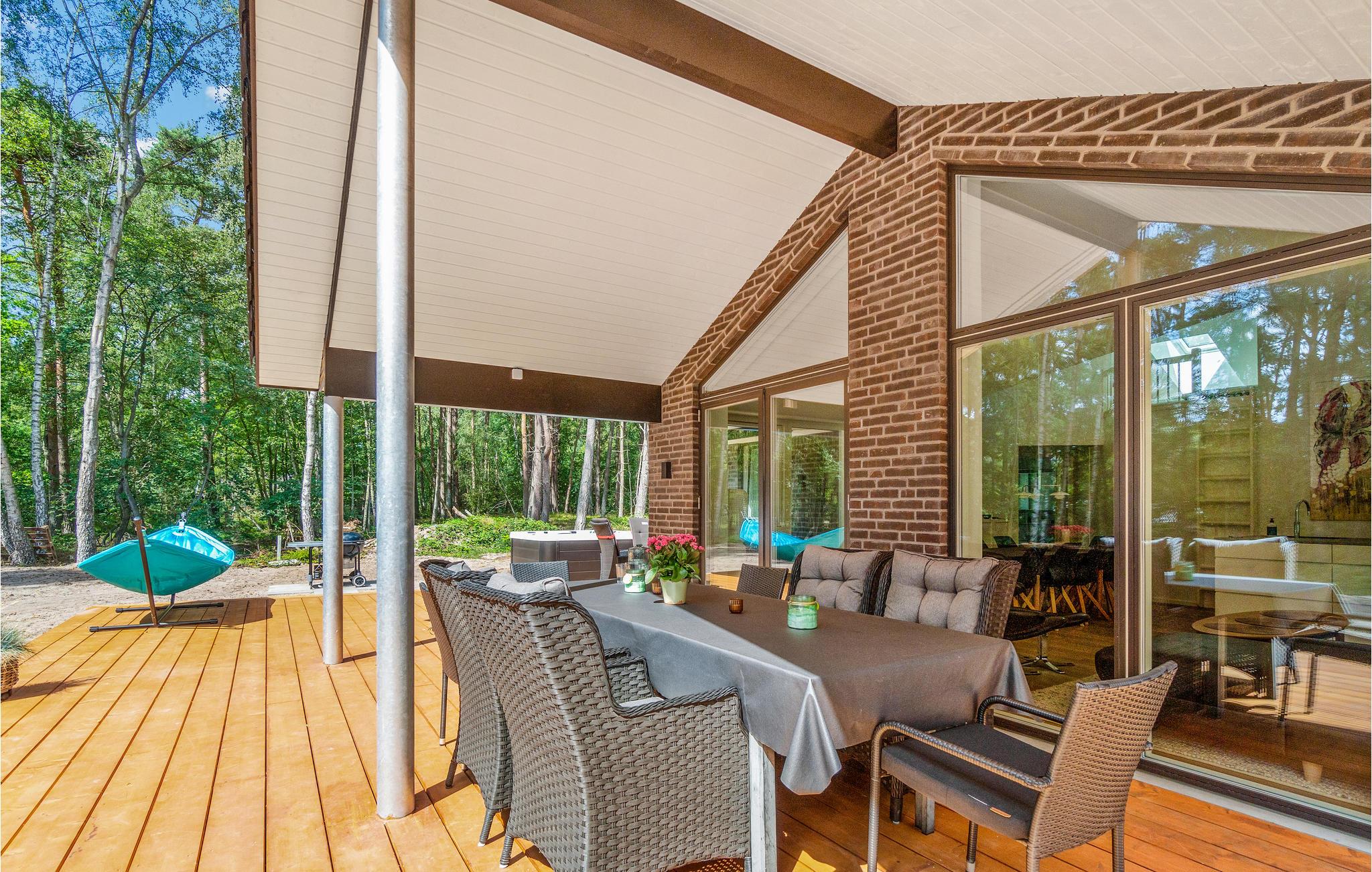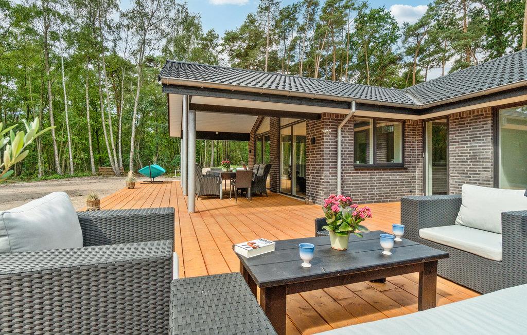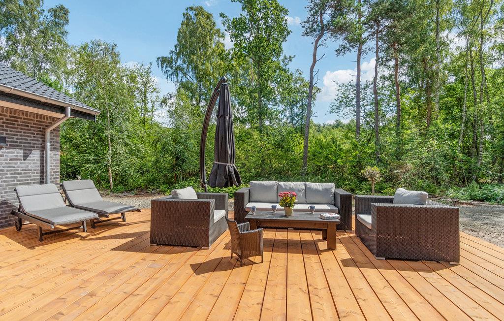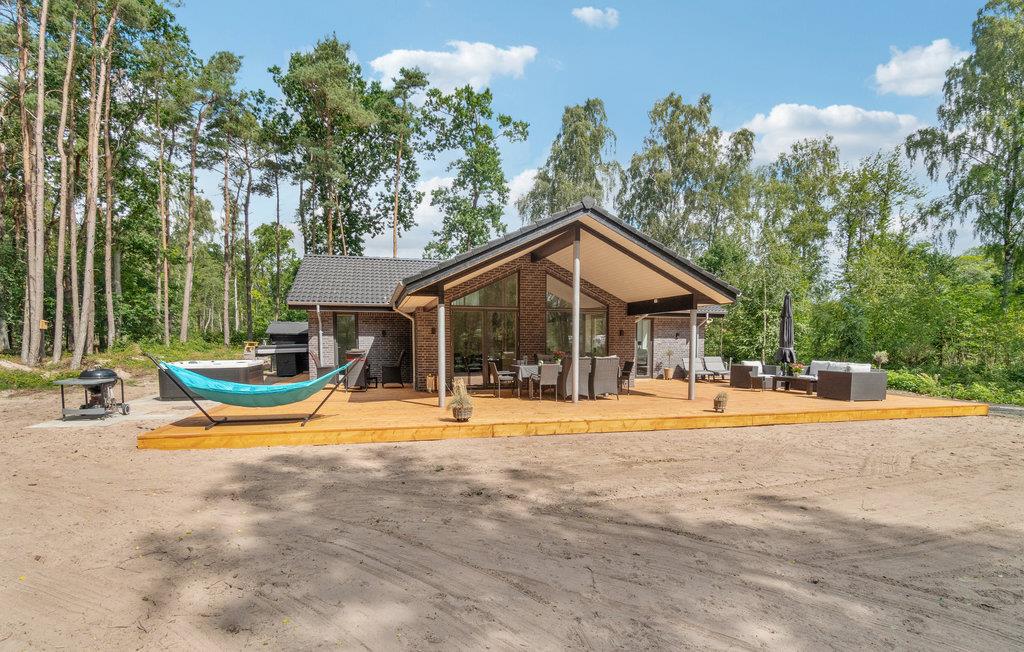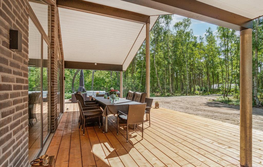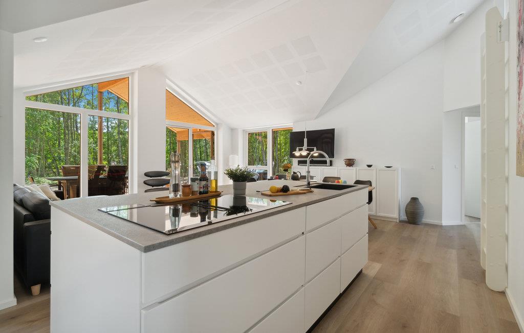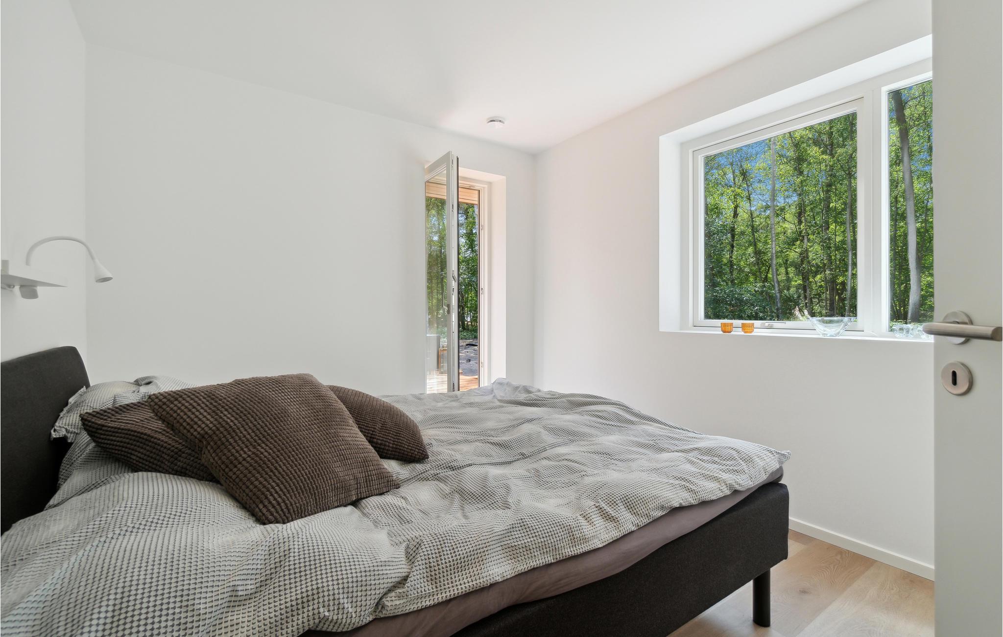 Moderne feriehus nær Dueoddes hvide sandstrand med spa og skovudsigt på Bornholm.