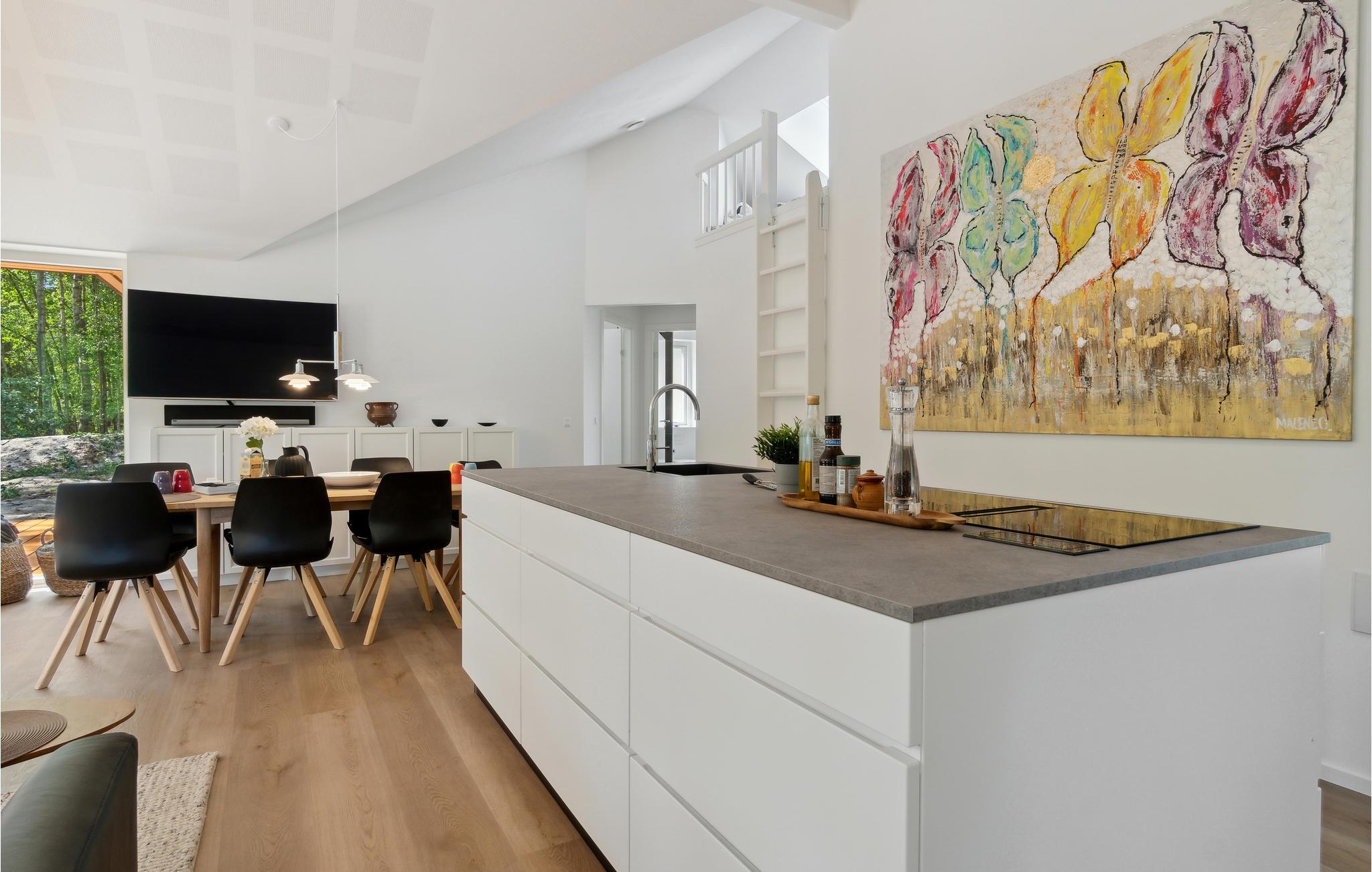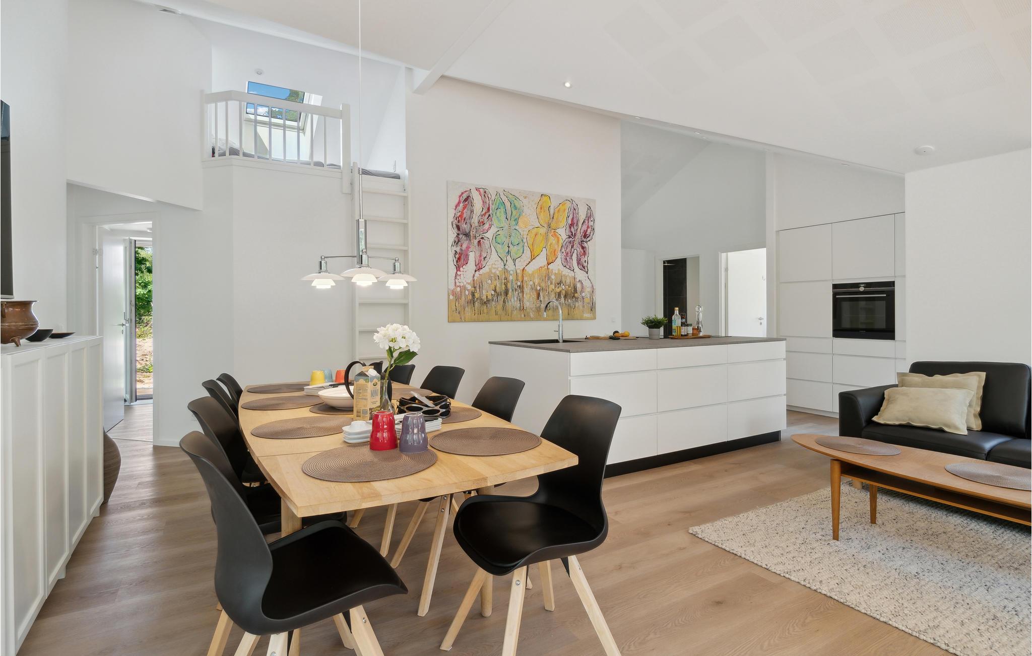 Hvis I drømmer om at tilbringe mest muligt af jeres ferie på Dueoddes flotte, hvide sandstrand, så får I ikke blot det, men også en enestående base i dette indbydende hus. Her kan I slå dørene op til moderne indretningsløsninger, lækre materialevalg og dejlige fællesarealer, som har et skønt lys fra vinduerne. Roen sænker sig automatisk, når I ankommer til den grønne grund, hvor I har udsigt til træerne hele vejen rundt. Hvis I vil gøre noget ekstra godt for jer selv oven på dagens program, kan I læne jer tilbage i det udendørs spabad, som kan benyttes i sommerhalvåret.