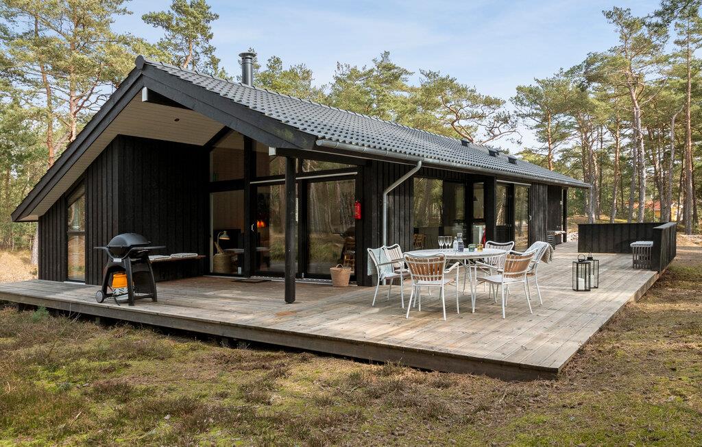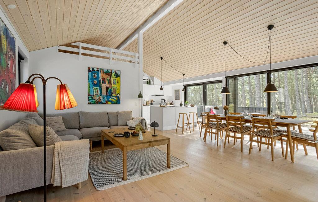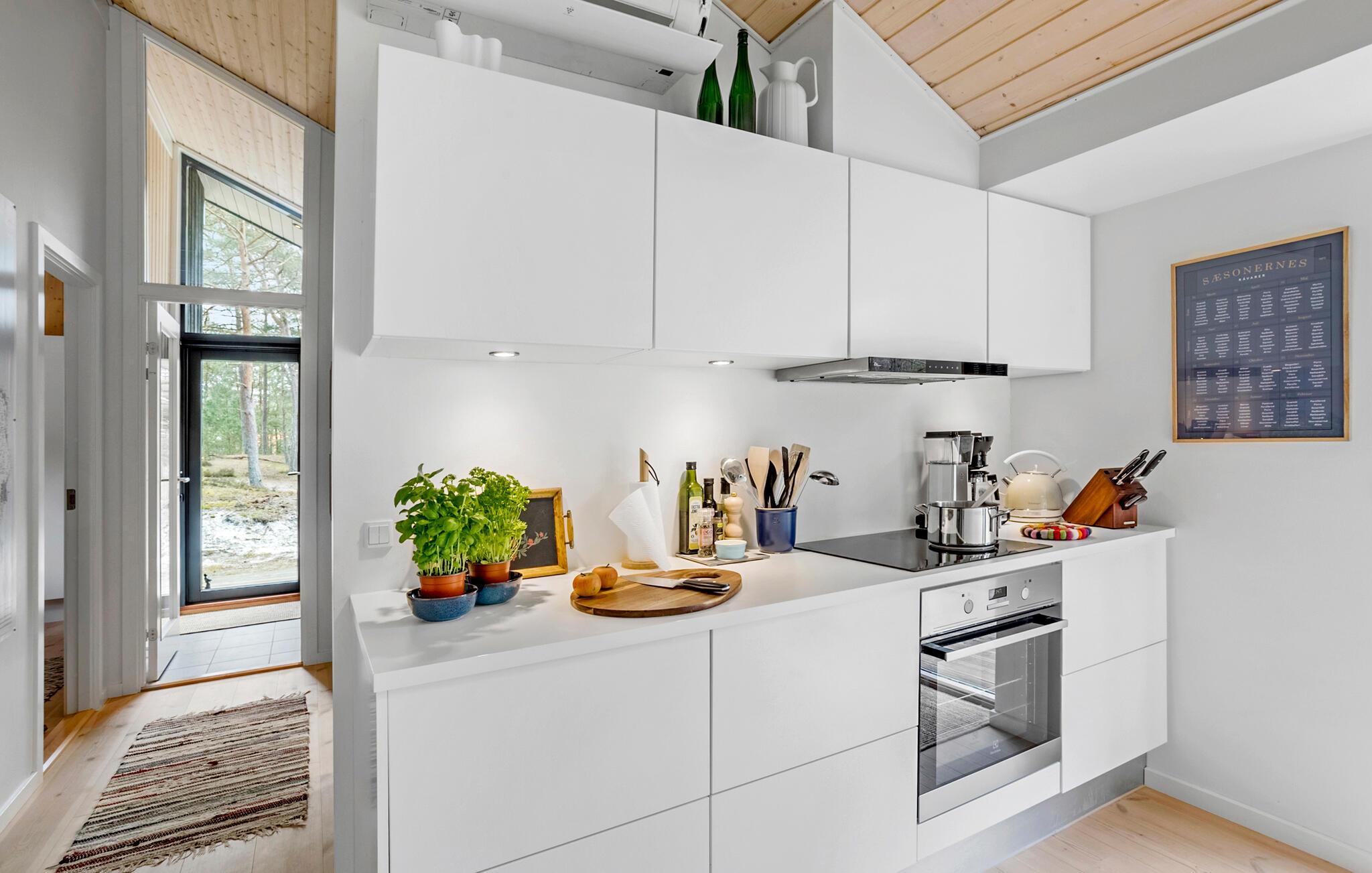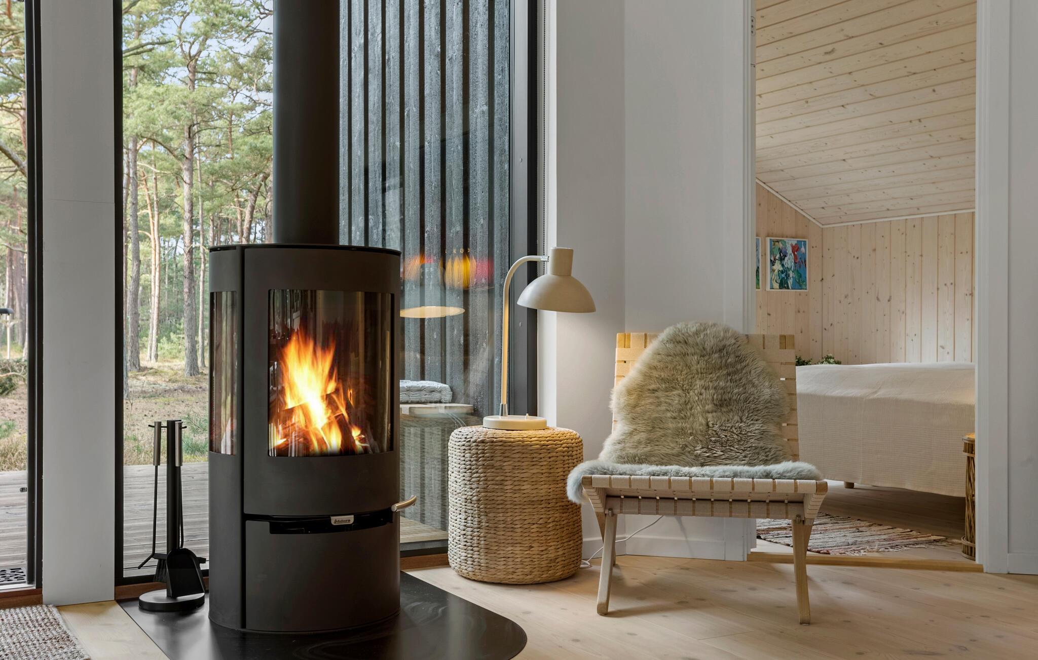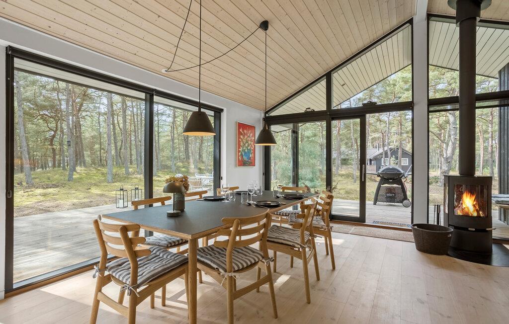 Jeres stilfulde feriehus på solskinsøen Bornholm tilbyder jer et fristed, hvor moderne design forenes med en naturskøn beliggenhed. Omgivet af høje træer kan I nyde afslappede feriedage med hele familien eller med venner, langt væk fra hverdagens stress og jag. Nyd udsigten til skoven fra den åbne opholdsstue med de store vinduespartier. Hyg jer sammen på den rummelige sofa, eller saml jer omkring det lange træbord til fælles måltider. Lav mad sammen i det lyse køkken med de rene linjer og direkte adgang til terrassen. Nyd varmen fra brændeovnen på kølige aftener, eller spil et brætspil i den hyggelige stue.