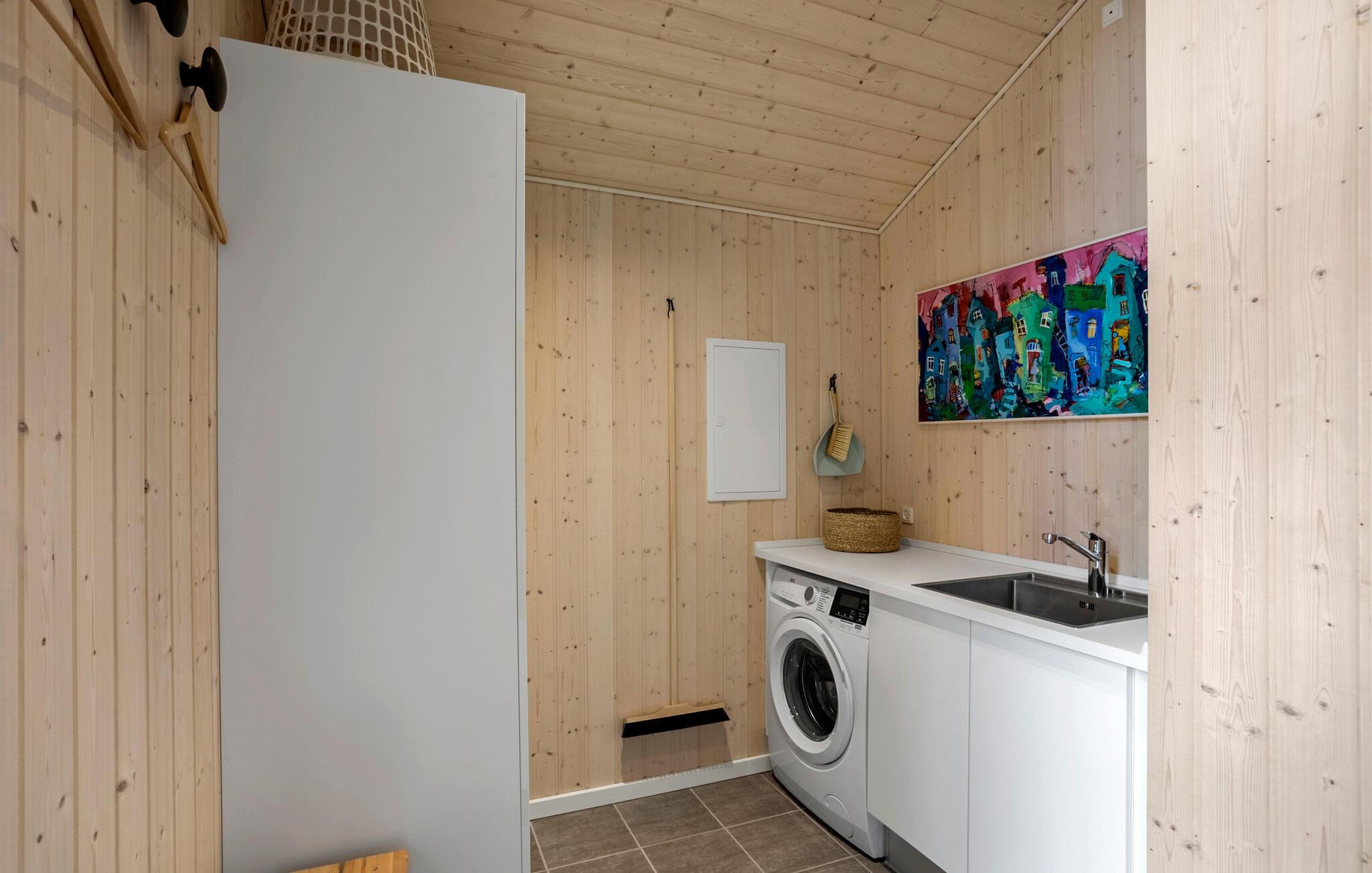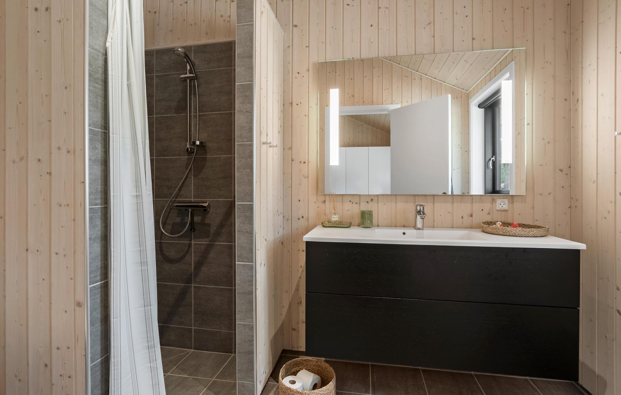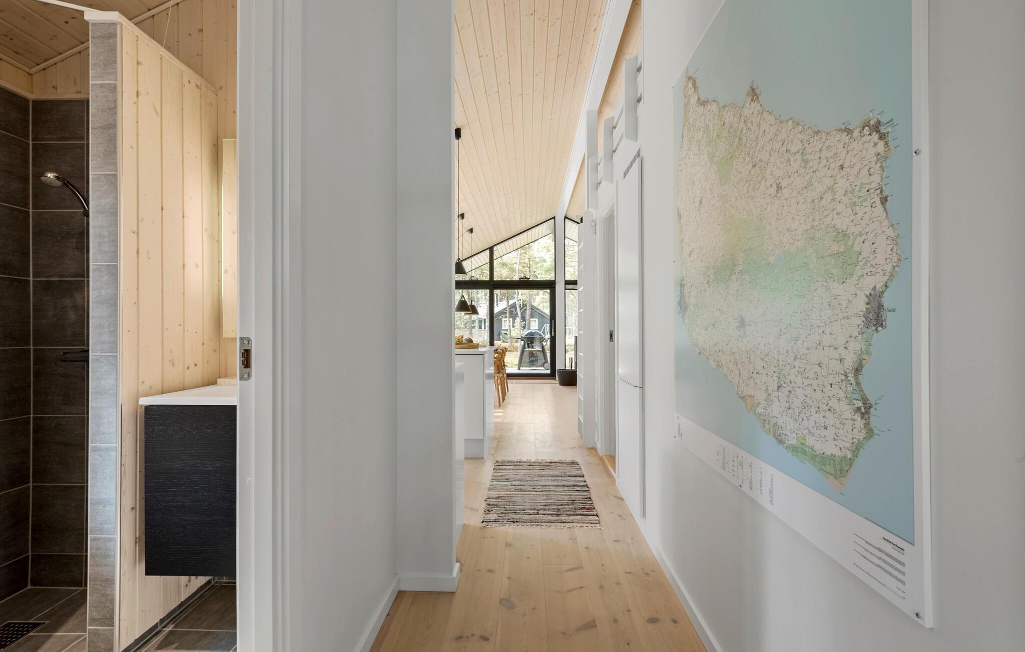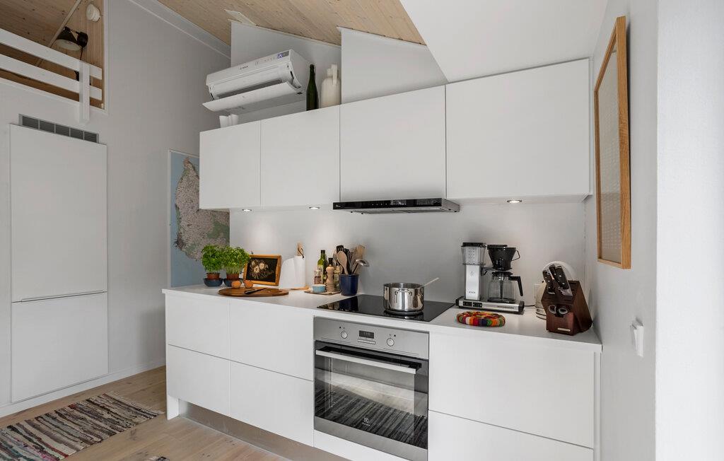 Jeres stilfulde feriehus på solskinsøen Bornholm tilbyder jer et fristed, hvor moderne design forenes med en naturskøn beliggenhed. Omgivet af høje træer kan I nyde afslappede feriedage med hele familien eller med venner, langt væk fra hverdagens stress og jag. Nyd udsigten til skoven fra den åbne opholdsstue med de store vinduespartier. Hyg jer sammen på den rummelige sofa, eller saml jer omkring det lange træbord til fælles måltider. Lav mad sammen i det lyse køkken med de rene linjer og direkte adgang til terrassen. Nyd varmen fra brændeovnen på kølige aftener, eller spil et brætspil i den hyggelige stue.