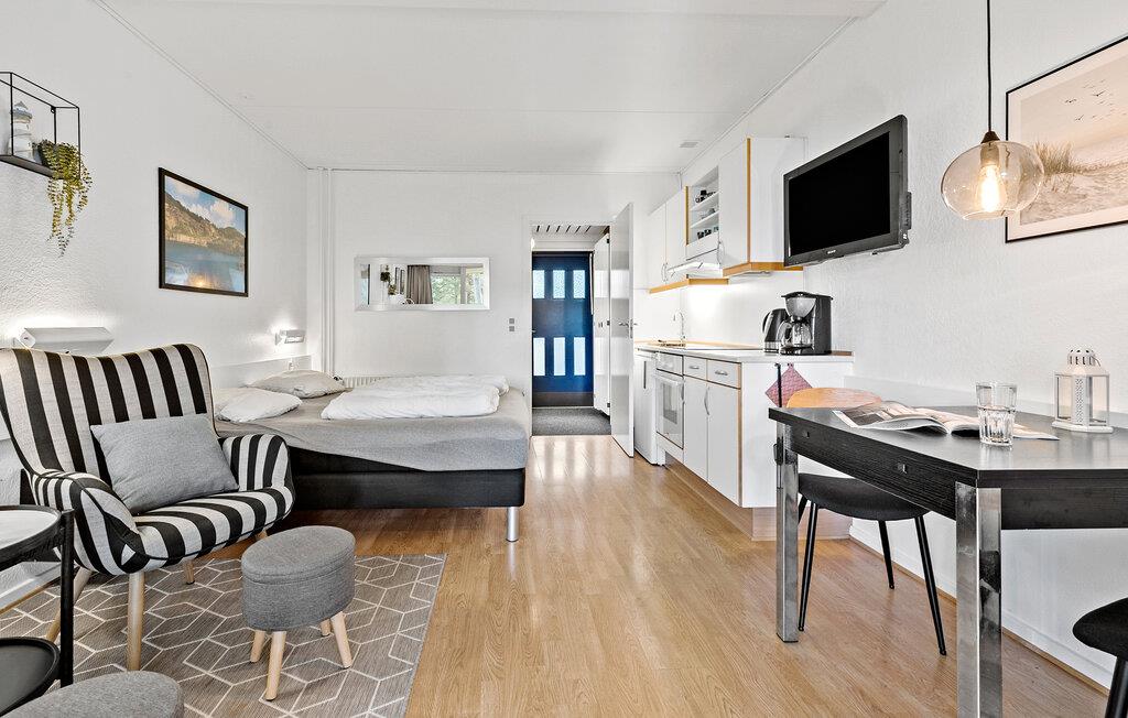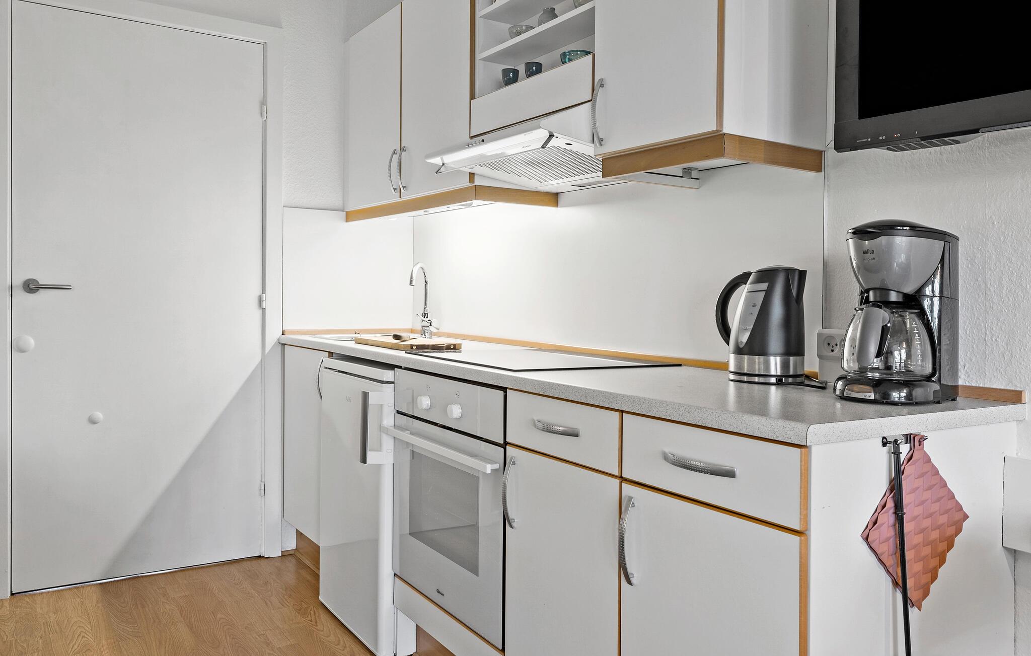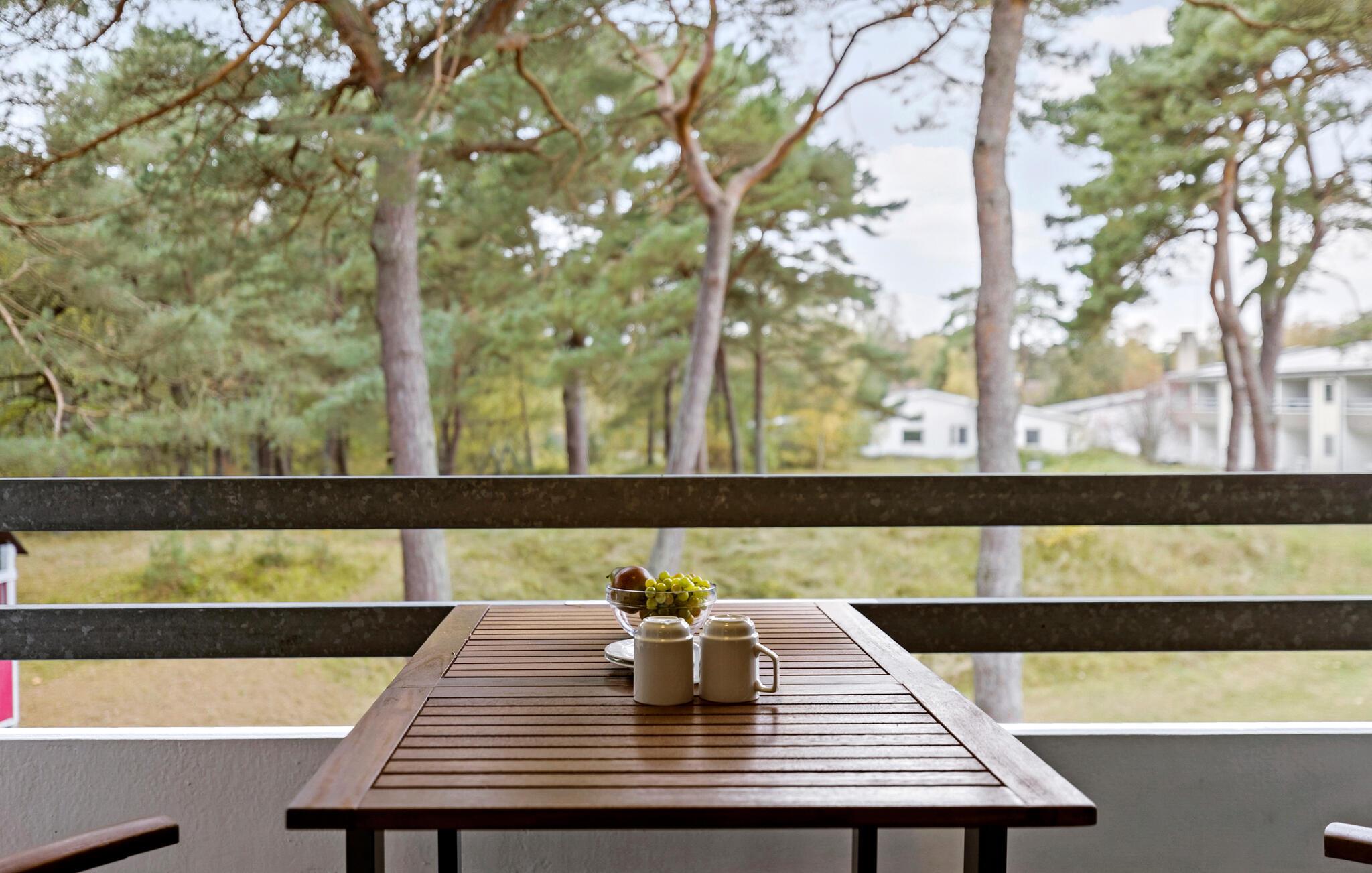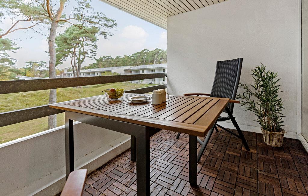 Her kan I lægge hverdagen bag jer og nyde roen i denne hyggelige bolig under en parferie. Start morgenen med morgenmad på balkonen, mens I nyder den fredfyldte natur og de rolige omgivelser. Om aftenen venter den hyggelige stue med komfortable møbler, det perfekte sted at afslutte dagen i en afslappet atmosfære. I det veludstyrede køkken kan I lave mad efter lyst og nyde måltiderne i spiseområdet eller udenfor på balkonen, når vejret er godt.