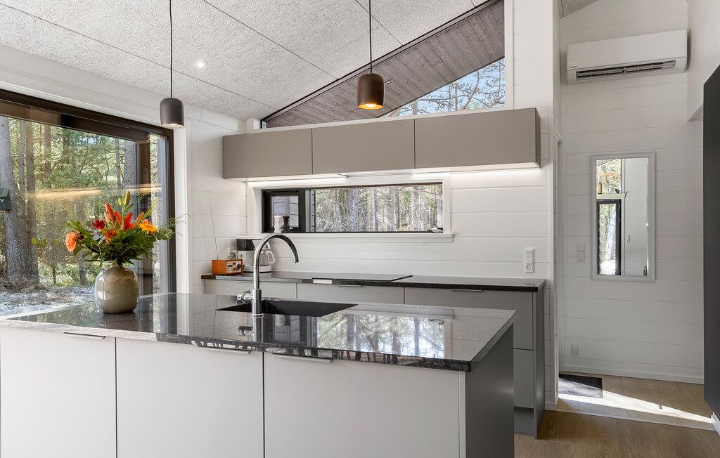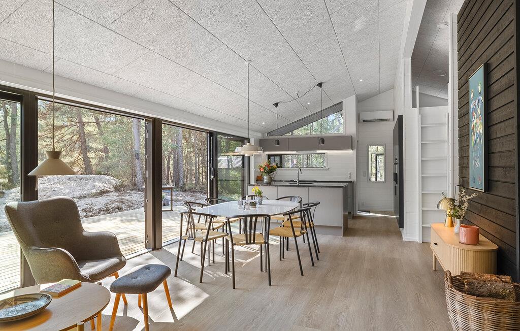 Dette stilfulde feriehus danner base for en herlig ferie i naturskønne rammer. Her bor I omgivet af klitter, sand og skov. Glæd jer til denne rolige oase med høj komfort. Nyd den uhindrede udsigt over landskabet fra den åbne opholdsstue med gulv til loft-vinduer. Læn jer tilbage i sofaen eller ved brændeovnen efter en lang dag på stranden. Dæk op til en en indbydende frokost ved spisebordet eller en sjov spilleaften. Slå jer løs i det moderne køkken med kogeø og masser af naturskønt lys - her får I de optimale betingelser for at kreere en lækker feriemiddag.
