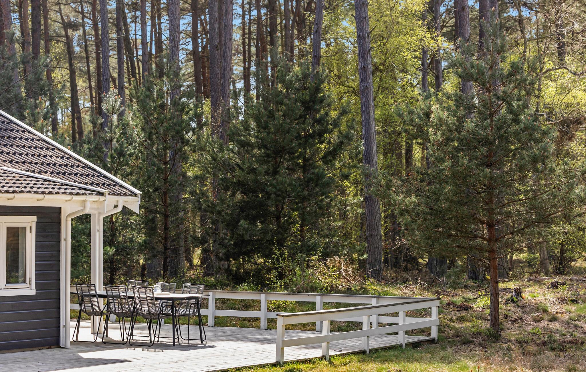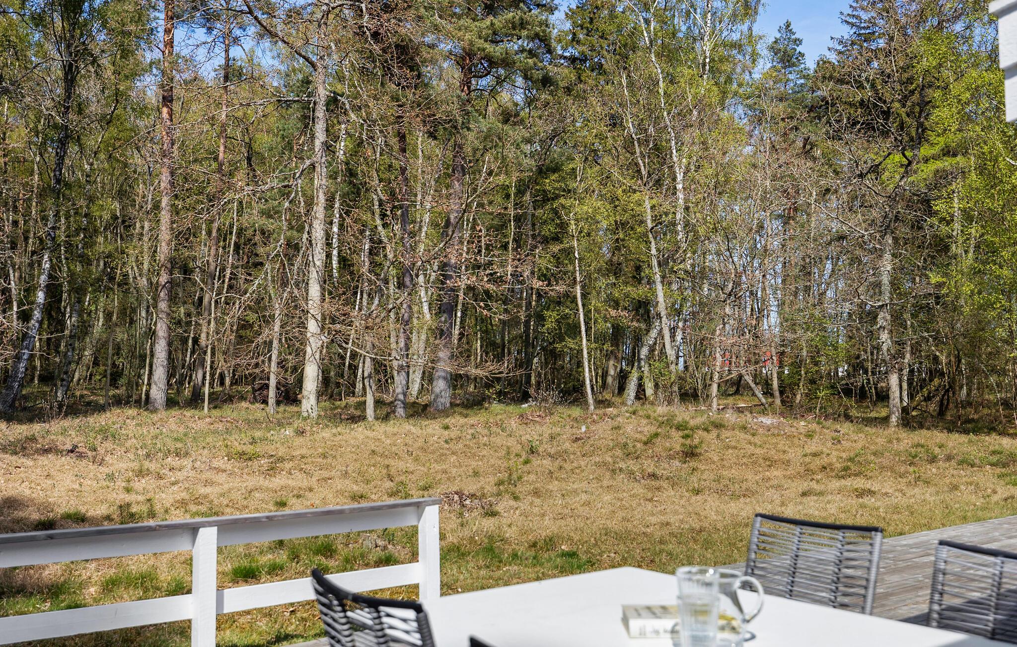 Udendørsområdet byder på masser af privatliv og plads til at trække vejret. Den store terrasse omgiver huset og er udstyret med havemøbler. Nyd måltiderne udendørs, læs en bog i solen eller nyd blot freden og roen. Den idylliske naturejendom grænser direkte op til skoven.