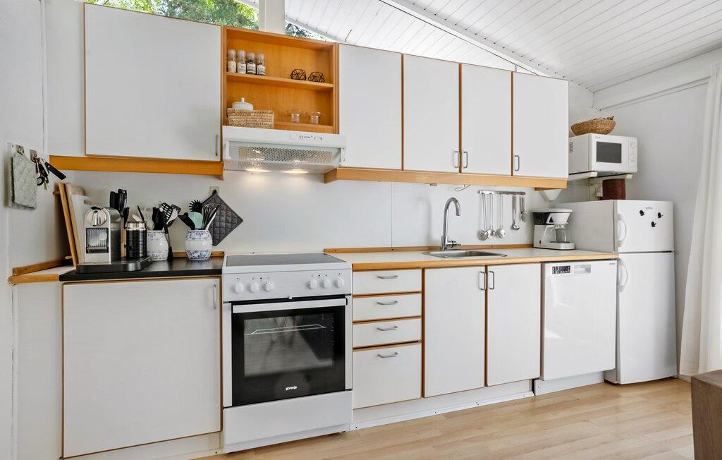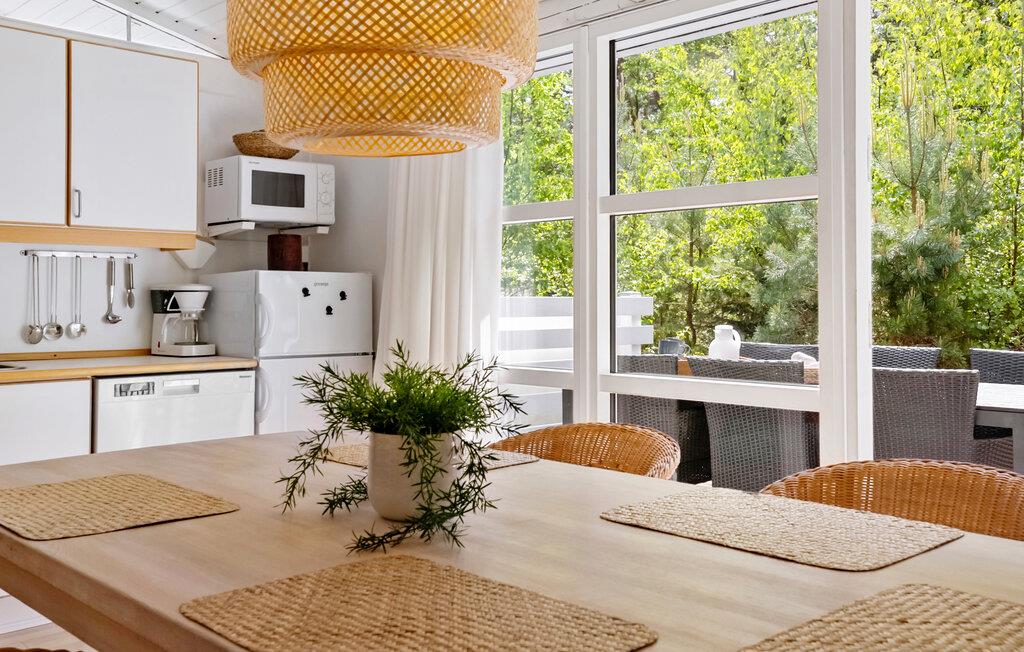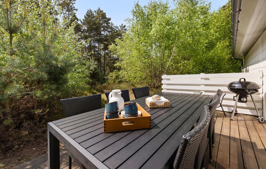 I et hyggeligt sommerhusområde ligger dette velindrettede feriehus med en pæn opholdstue med komfortable møbler og nær til dejlig sandstrand. Sommerhuset byder på et nydeligt åbent køkken, hvor det er nemt at tilberede de mange feriemåltider, en velindrettet spisestue, ligesom der er både brændeovn og varmepumpe til de kølige sommeraftener. På en varm sommerdag kan varmepumpe og bruges som aircondition. Her i huset har I naturligvis også gratis internet, ligesom der også er 2 gode terrasser til rådighed, hvor I rigtig kan nyde ferien og bare slappe af, bl.a. med udsigt til den flotte natur. Fra dette hyggelige sommerhus har I ikke langt til en dejlig sandstrand og gode cykelveje.