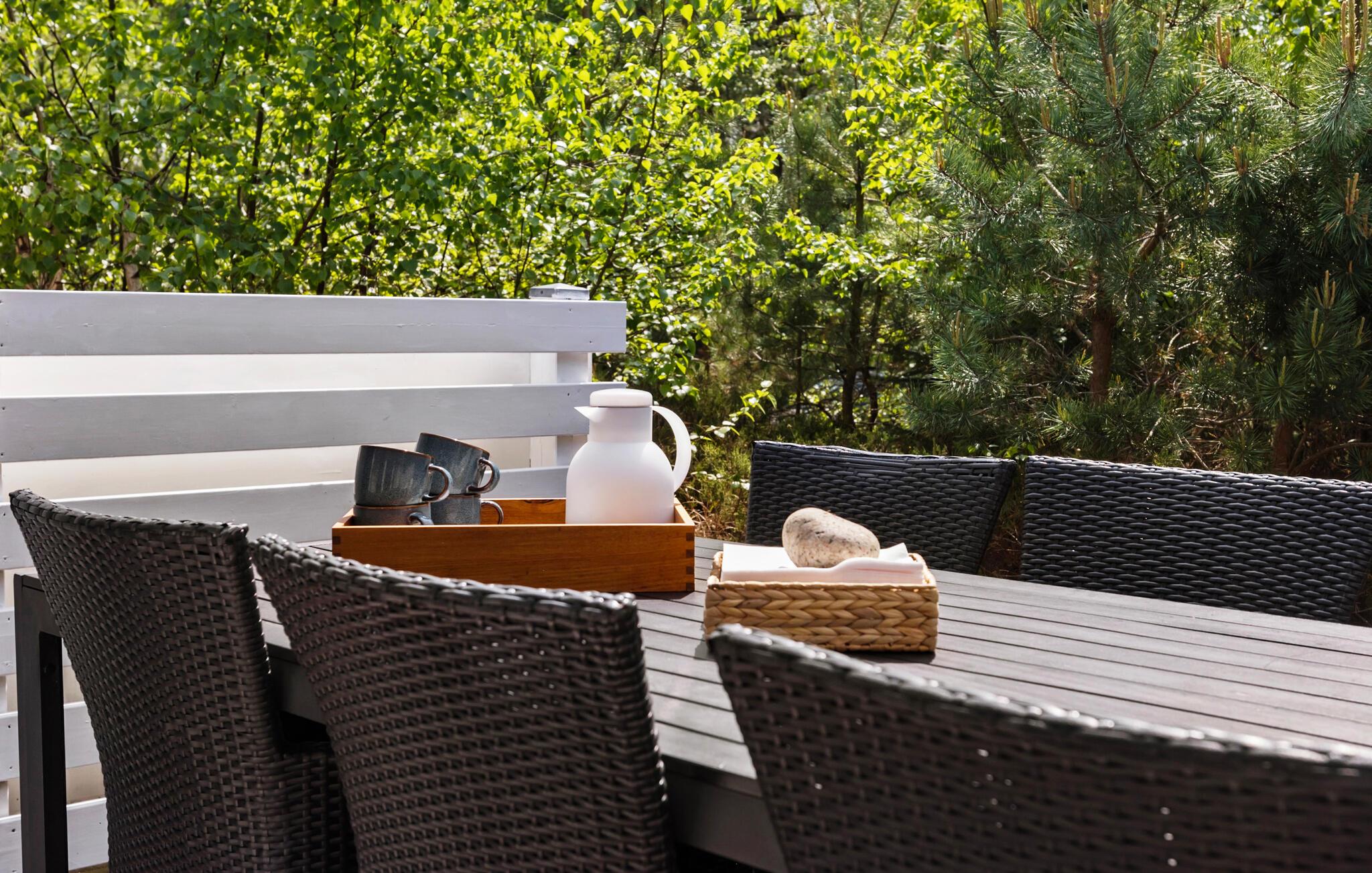 Hyggeligt sommerhus tæt på Dueoddes sandstrand med komfortable møbler og to terrasser til afslapning.