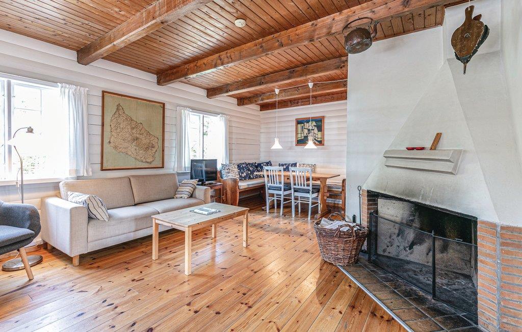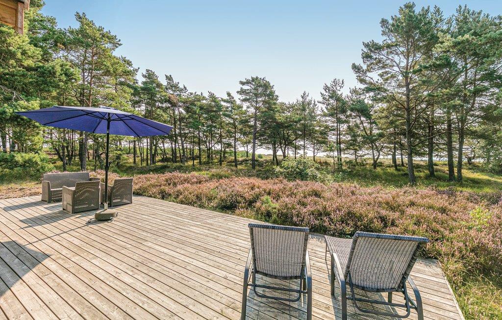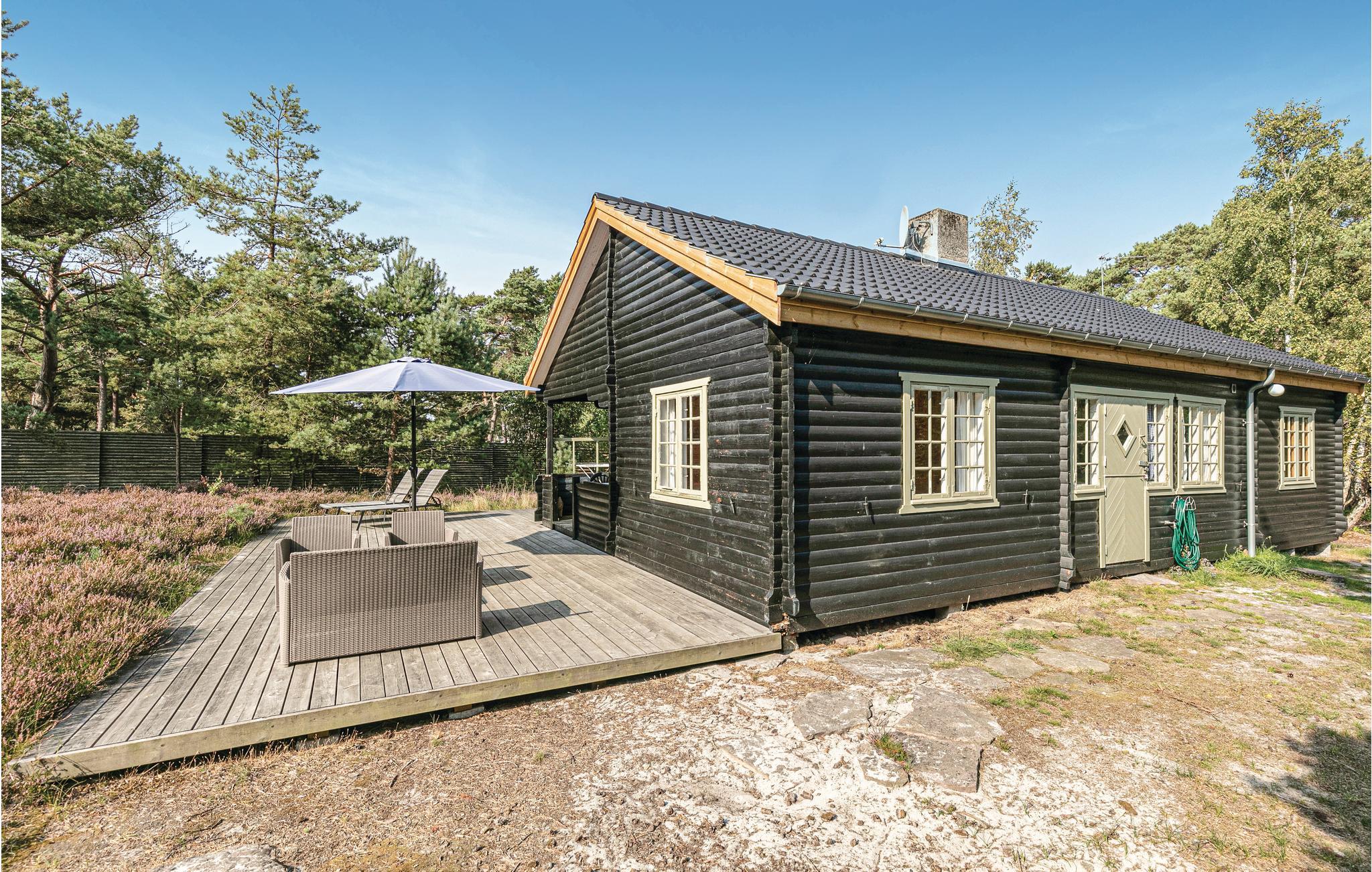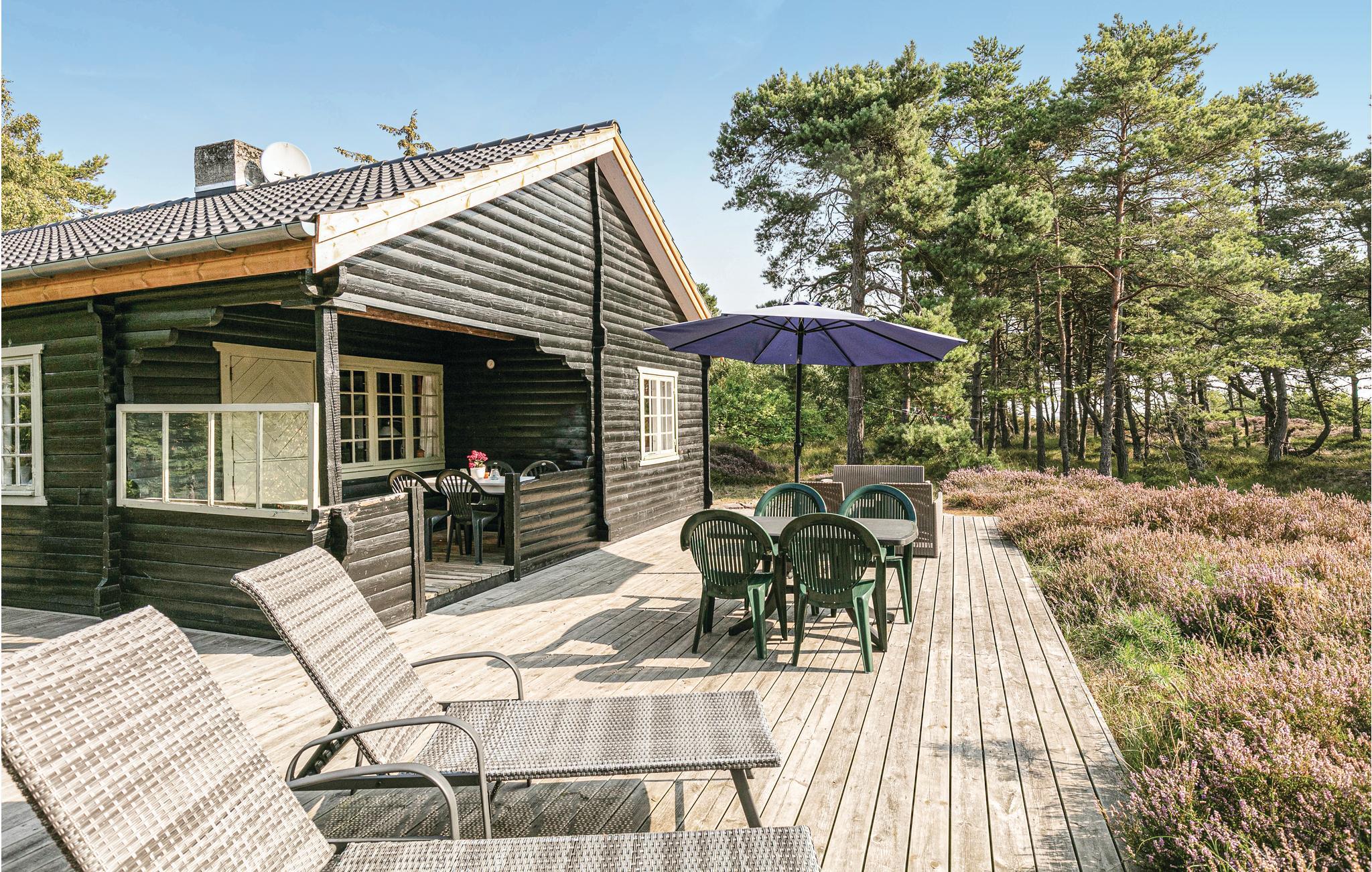 Omgivet af smuk natur på en enorm naturgrund i Dueodde, lige ned til vandet, finder I dette sorte bjælkehus. Indenfor sørger det naturlige træ, pejsen og de små detaljer for en varm atmosfære. Lav mad sammen og planlæg jeres aktiviteter ved spisebordet, hvorfra I har en dejlig udsigt. Senere kan I hygge jer i sofaen til lyden af de knitrende flammer i pejsen. Udenfor venter mange skønne timer. På terrasserne finder I altid både en skyggeplads og en skøn solplet på varme dage. Mens børnene muntrer sig med at løbe rundt i den dejlige natur på grunden, kan I tilberede maden. Smid håndklædet over skulderen og forfrisk jer i vandet. Børnene vil helt sikkert løbe i pendulfart mellem huset og stranden.