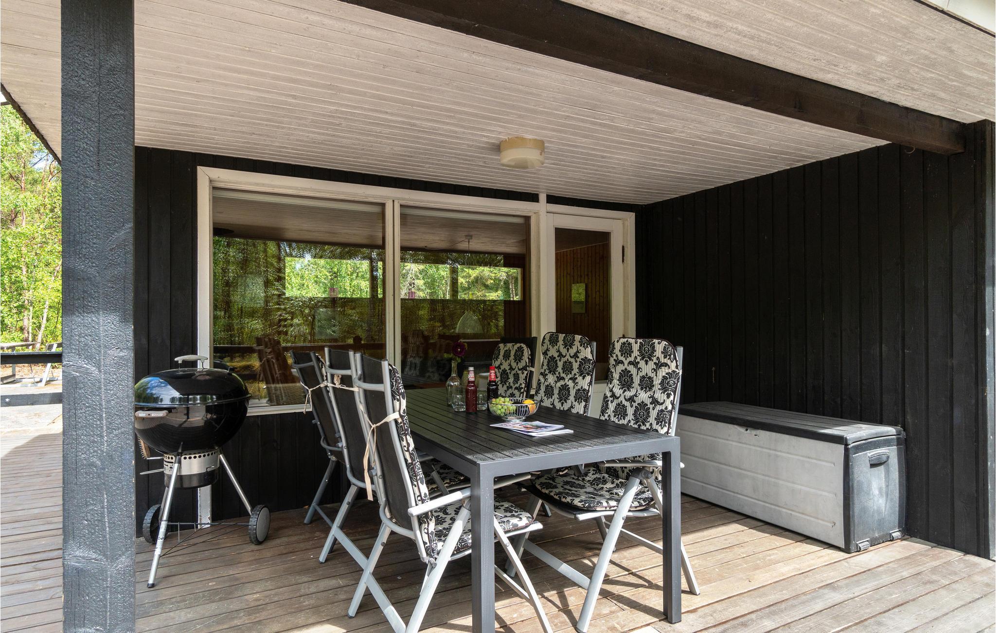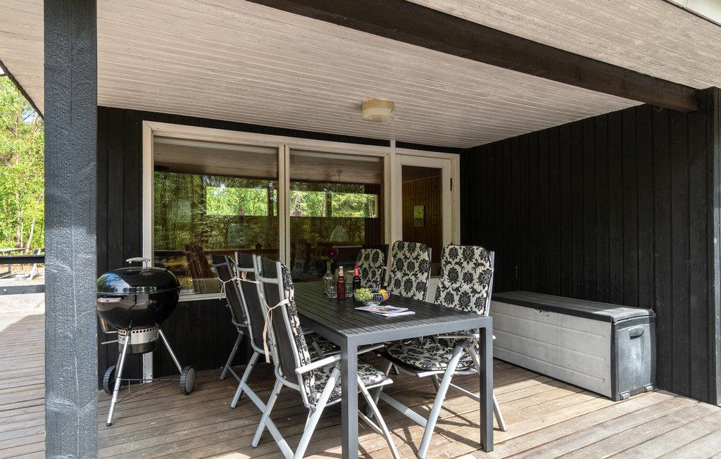 Hyggeligt og velbeliggende træferiehus på Dueodde, der er blevet udbygget med et stort, lyst forældresoverum med direkte udgang til en dejlig træterrasse. Huset har en hyggelig opholdsstue med udgang til god sydvendt overdækket og åben terrasse. Fra terrassen er der udsigt til flot natur med bevoksning af lyng og træer. Terrassen indbyder til feriehygge og grillaftener. Feriehuset ligger nær den børnevenlige og finkornede badestrand med de flotte sandklitter, nemlig een af Danmarks bedste sandstrande, Dueodde. Huset ligger i gåafstand til restauranter og kiosk. Lille indendørs svømmehal (250 m). Cykelsti i nærheden til bl.a. det populære Snogebæk med kvalitetsbutikker, glaspusteri og røgeri. Kort sagt: et herligt feriehus på en rolig og smuk naturgrund.