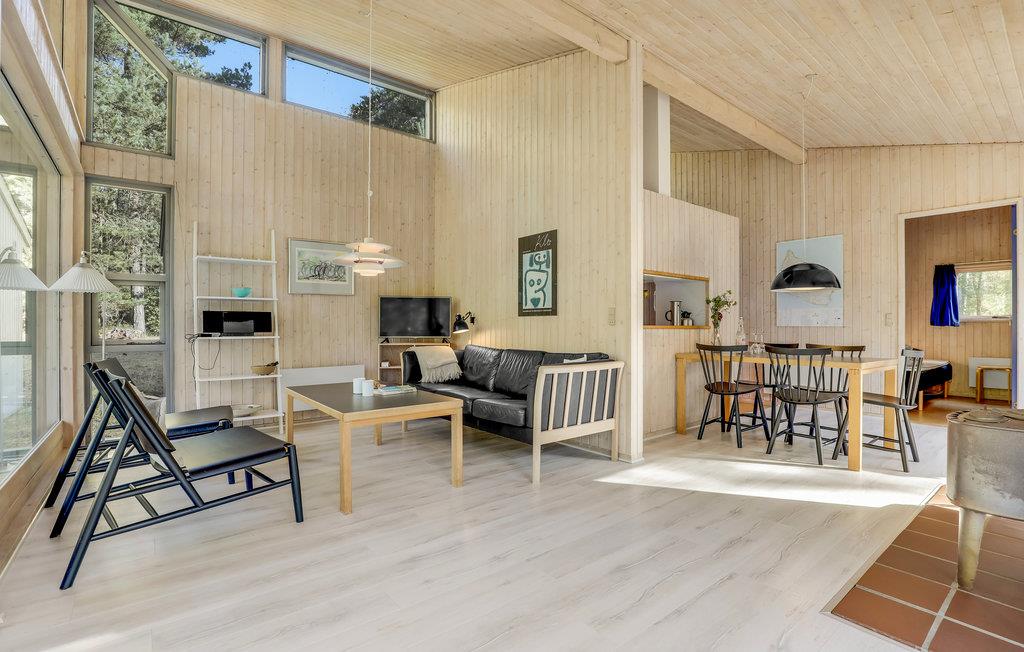 Husets hjerte er den lyse opholdsstue, hvor I kan se fjernsyn, høre radio, spille spil og i køligere sæsoner nyde varmen og hyggestemningen fra brændeovnen. De store vinduespartier giver et dejligt lysindfald og et godt udsyn til de grønne omgivelser. Der er behagelig gulvvarme på badeværelset.