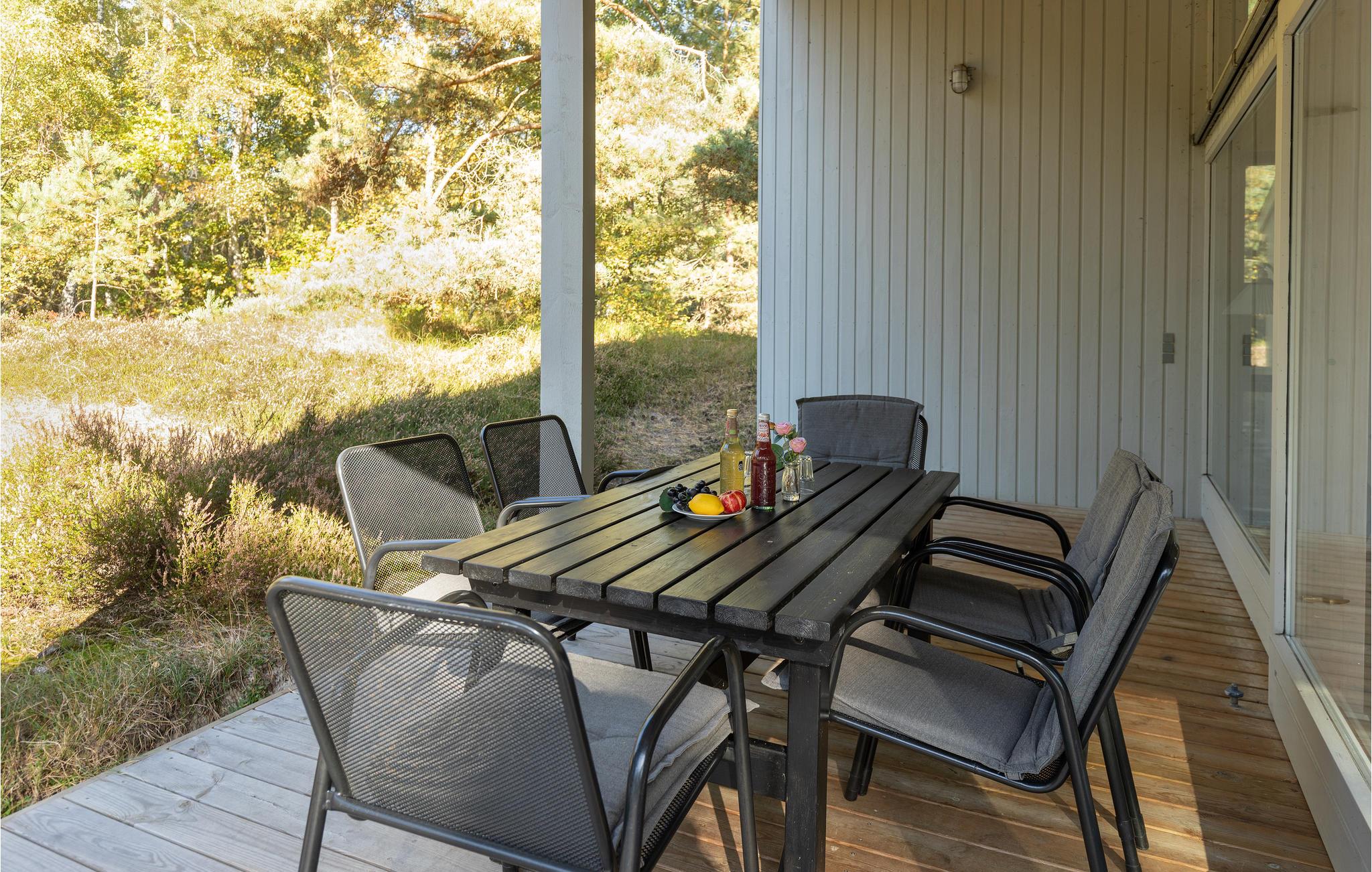 Arkitekttegnet træsommerhus nær Dueoddes børnevenlige sandstrand med stor terrasse og brændeovn.