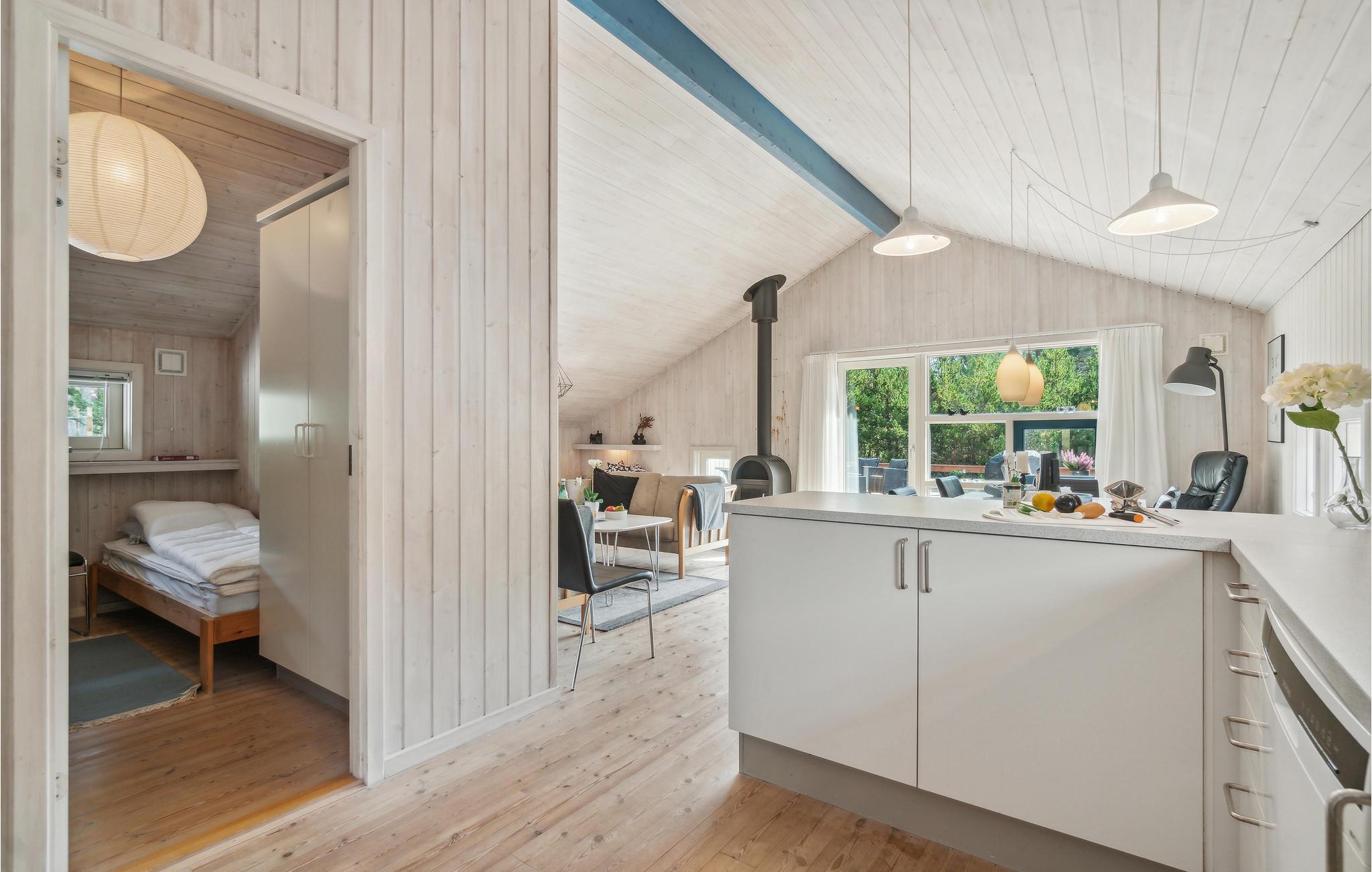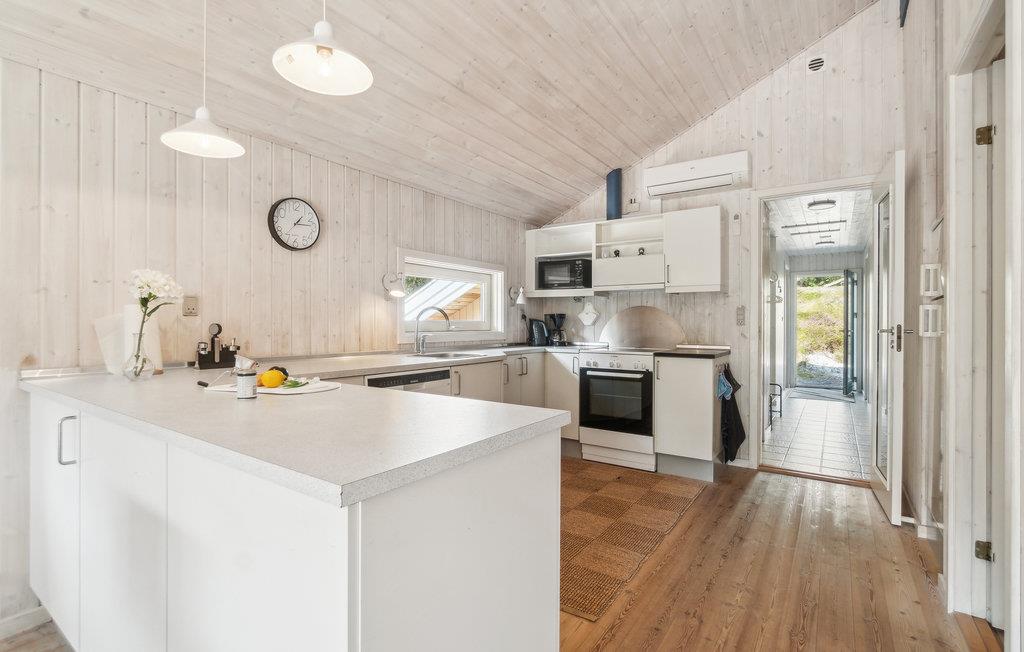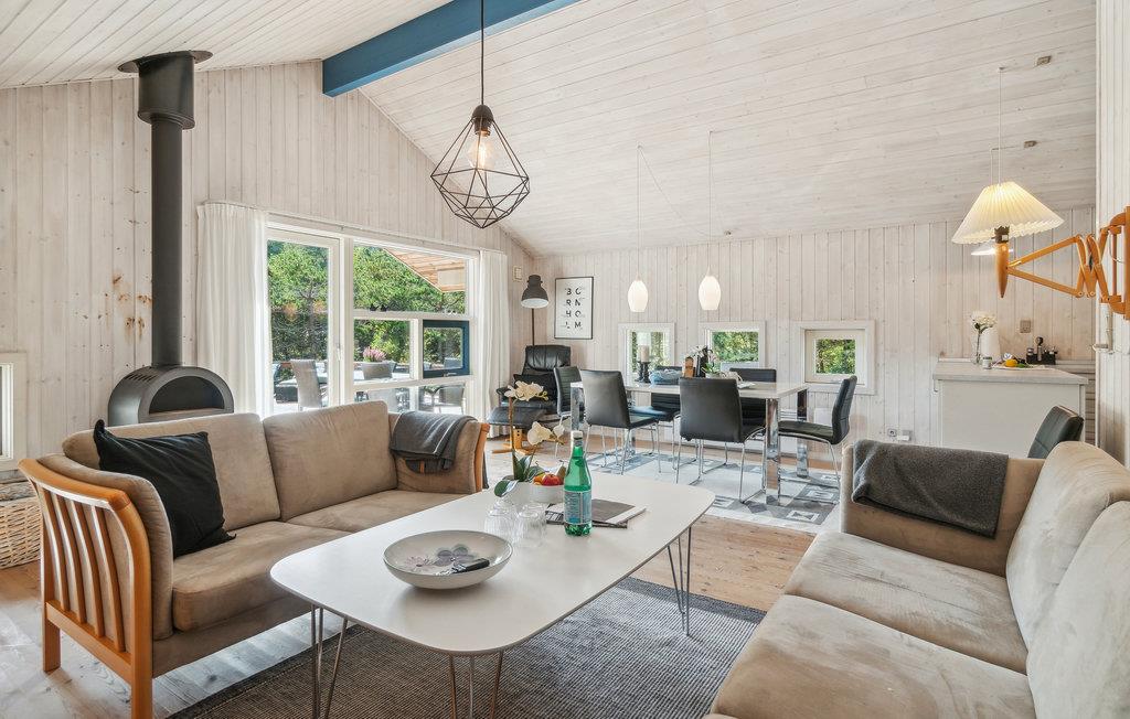 Huset er moderne og lyst indrettet. Det naturlige samlingspunkt er den kombinerede opholds- og spisestue, hvor I kan flade ud i bløde møbler, se fjernsyn, høre radio eller musik, spille spil og bare hyggesnakke. Om vinteren kan I nyde varmen og hyggestemningen fra brændeovnen. I stuen finder I en alkove med to sovepladser. I det åbne, veludstyrede køkken er det en fornøjelse at lave mad. Et af husets højdepunkter er det store badeværelse med behagelig gulvarme samt spa og sauna til herlig afslapning efter en aktiv feriedag.