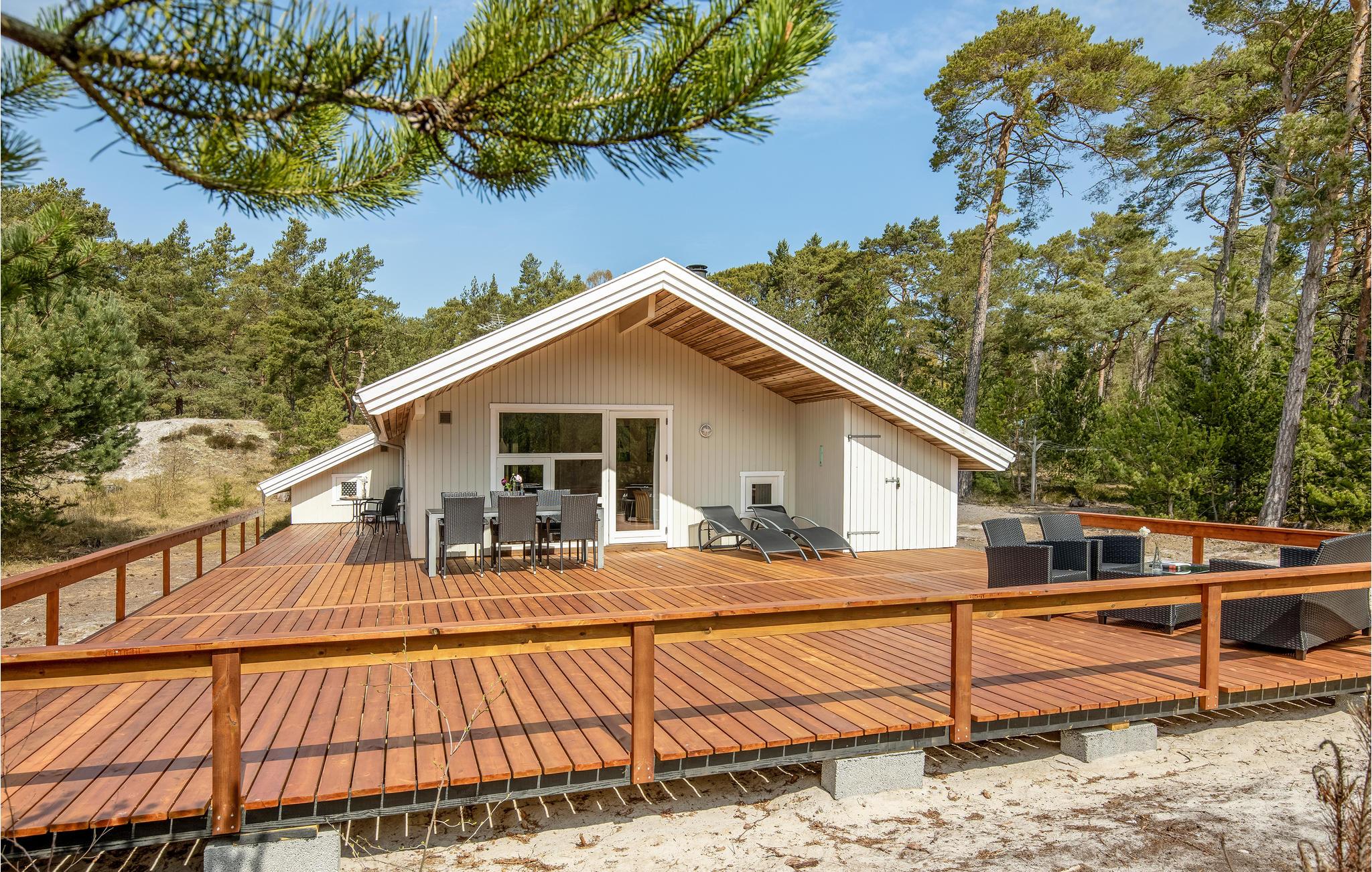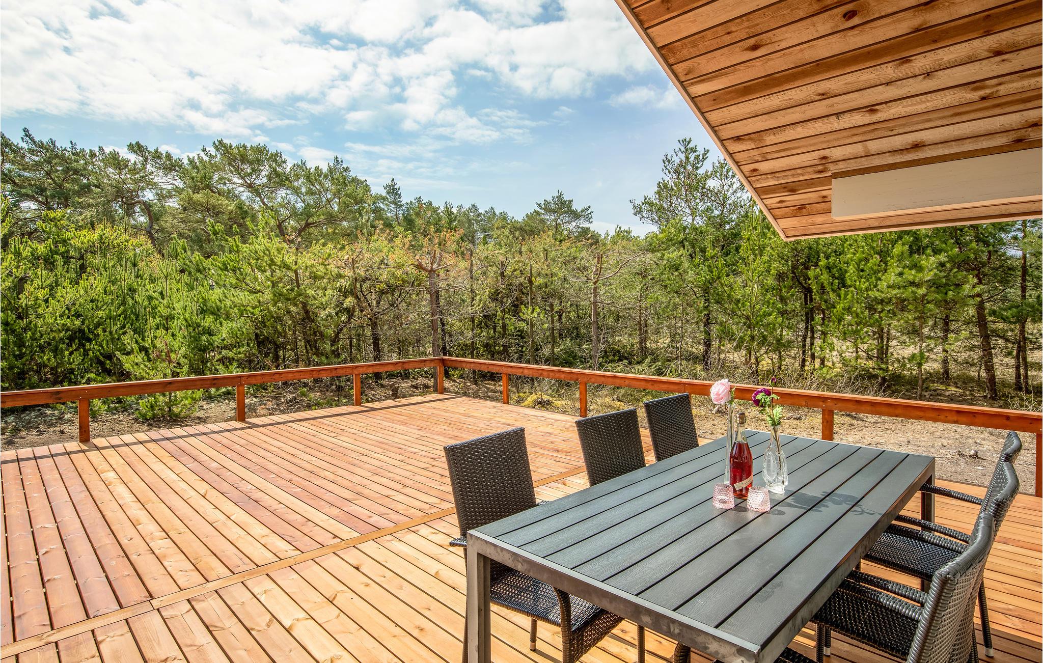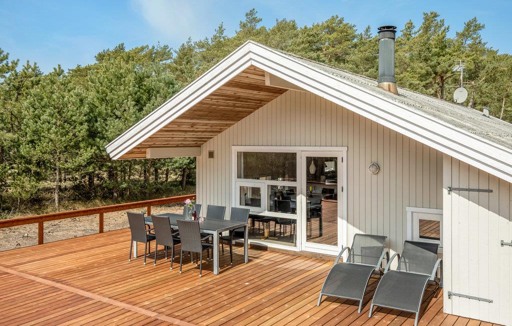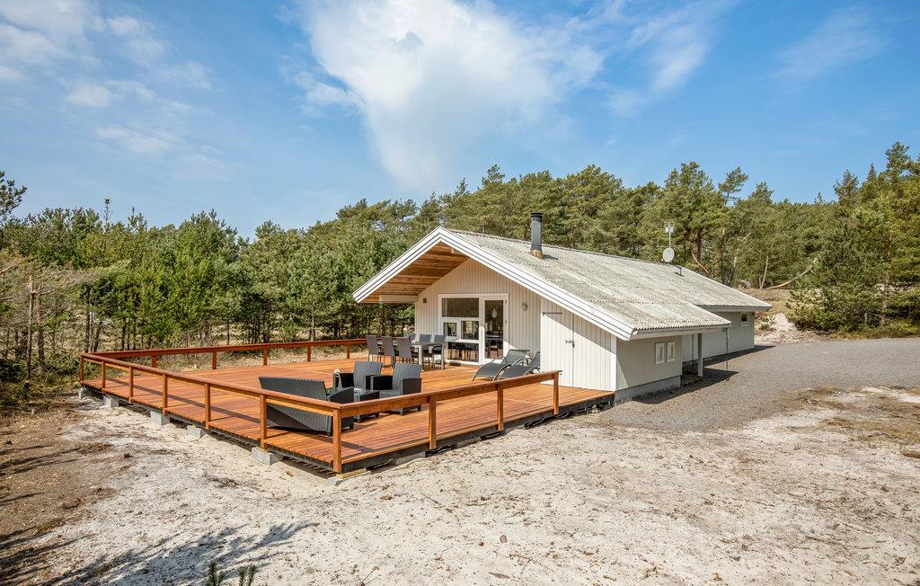 Indbydende sommerhus nær Dueoddes sandstrand med spa, sauna og stor delvist overdækket terrasse.