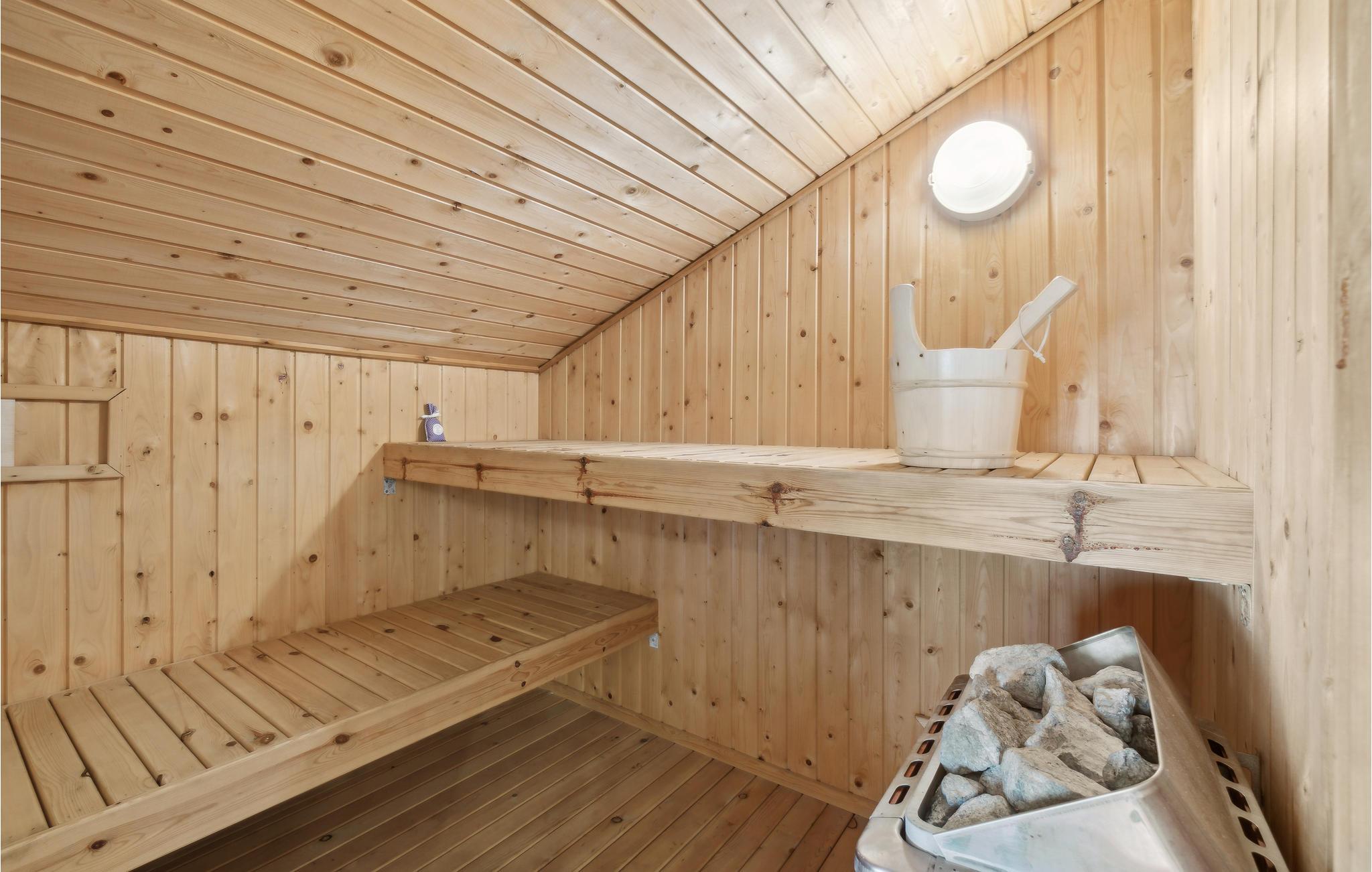 Tilbring afslappende dage i dette indbydende træhus, der kombinerer komfort og hygge. Kun en kort gåtur fra havet kan I nyde en dejlig ferie i stilfulde omgivelser – ideelt for familier og par, der søger natur og afslapning. Træd ind i den rummelige opholdsstue med brændeovn, der skaber en varm atmosfære. Gør det behageligt i sofaen, se en film eller nyd blot den knitrende ild. Et par trin fører til det åbne, veludstyrede køkken, hvor I kan lave mad og spise sammen. Husets sauna lægger op til at nyde øjeblikke med beroligende ro.