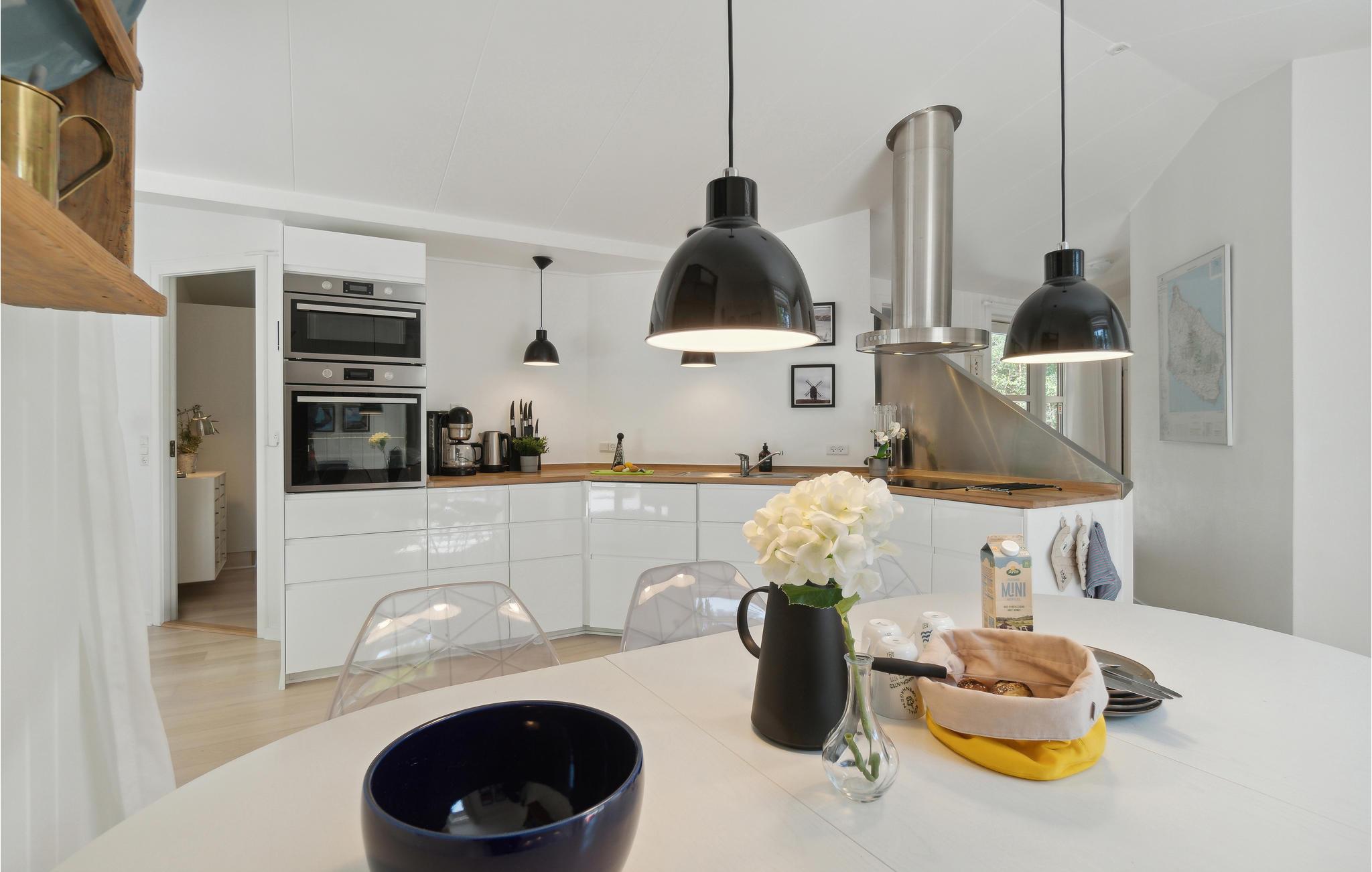 Huset er moderne og lyst indrettet med flotte trægulve overalt og store vinduer, der giver et dejligt lysindfald og udsyn til de grønne omgivelser. Den smagfulde opholdsstue er husets naturlige samlingspunkt, hvor I kan flade ud i bløde møbler og se fjernsyn, høre musik, spille spil og i køligere sæsonen nyde varmen og den hyggelige stemning fra brændeovnen (brænde er inkluderet). I det flotte, veludstyrede og åbne køkken er det en leg at tilberede dejlige feriemåltider. Det store badeværelse har behagelig gulvvarme og er udstyret med en sauna til skøn ferieafslapning.