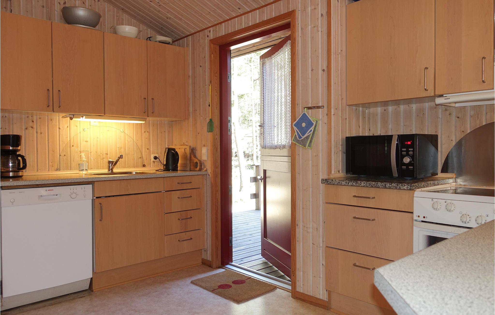 Trægulve, vægge- og lofter i kombination med åbent til kip giver den rummelige opholdsstue charme og en hyggelig atmosfære. Her kan I se fjernsyn, høre radio eller musik og om vinteren nyde varmen fra brændeovnen. I forbindelse med opholdsstuen ligger det åbne køkken, således at feriens kok eller kokke kan holdes med selskab under madlavningen. Der er vaskemaskine og gulvvarme på badeværelset.