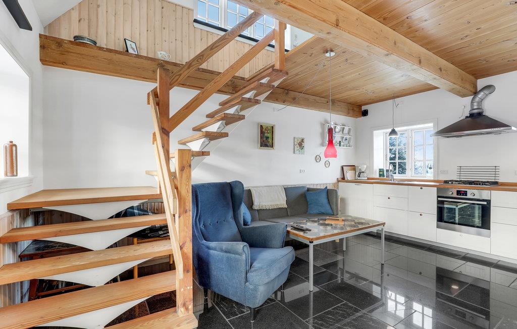 I stueetagen finder I lejlighedens hjerte: Den kombinerede spise- og opholdsstue med åbent køkken. Her kan I sidde og slappe af, se fjernsyn, tilberede jeres feriemåltider og planlægge aktiviteterne for feriedagene. En trappe fører op til 1. sal, hvor I finder lejlighedens badeværelse, et fint soveværelse med dobbeltseng og to enkeltsenge på en repos.