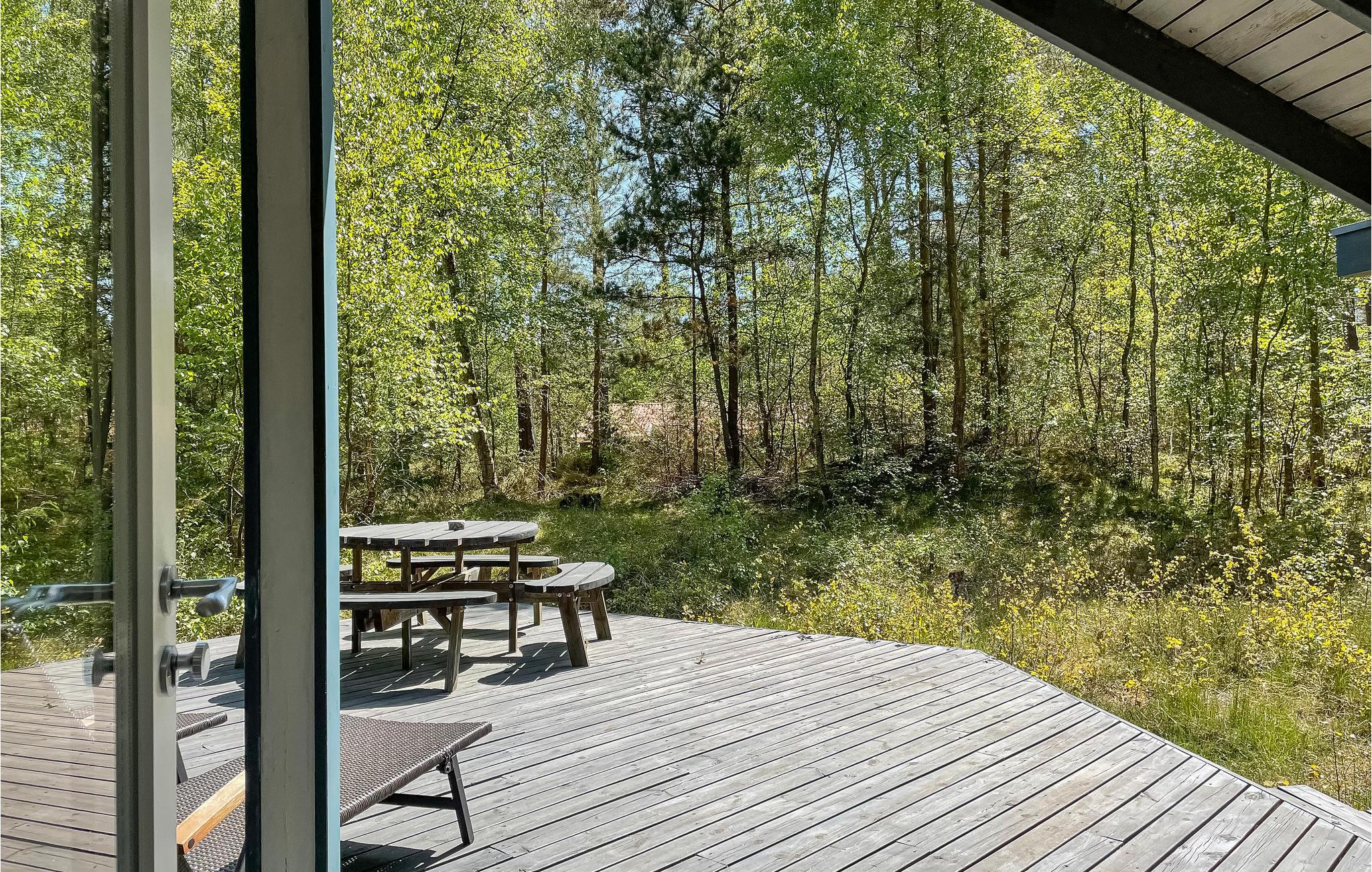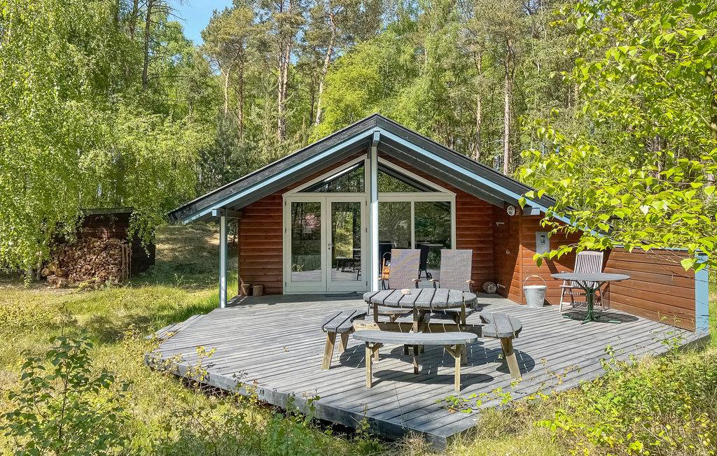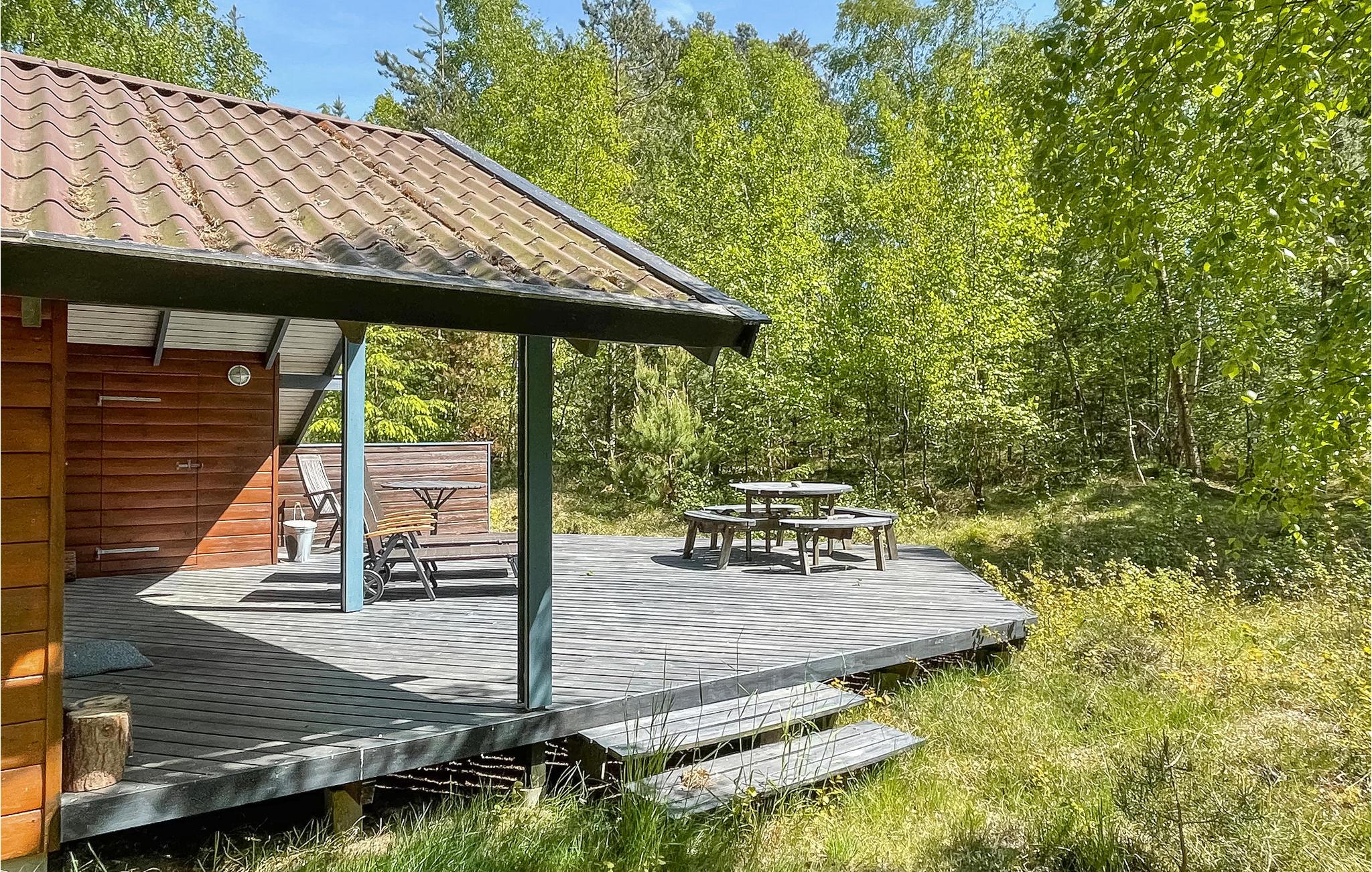 Skønt feriehus i træ, som ligger på en helt ugenert, skovklædt naturgrund nær Dueoddes skønne sandstrand.