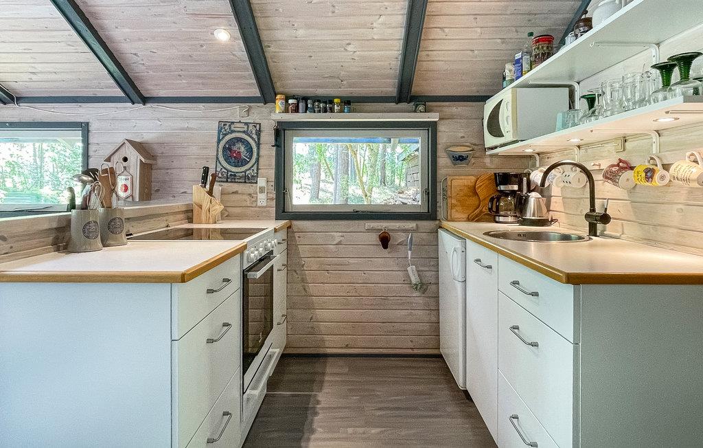 Velkommen til dette charmerende og lyse feriehus, der med sin trægulve, vægge- og lofter i kombination med åbent til kip har en rummelig og hyggelig atmosfære. I den smagfuldt indrettede opholdsstue kan I se fjernsyn, høre radio eller musik, samles om spisebordet og om vinteren nyde varmen fra brændeovnen (brænde er inkl.). Der er også en dejlig alkove i stuen. Det åbne, veludstyrede køkken ligger i forbindelse med stuen, således at feriekokken/kokkene kan holdes med selskab. Derudover består huset af et fint badeværelse og to gode soveværelser.