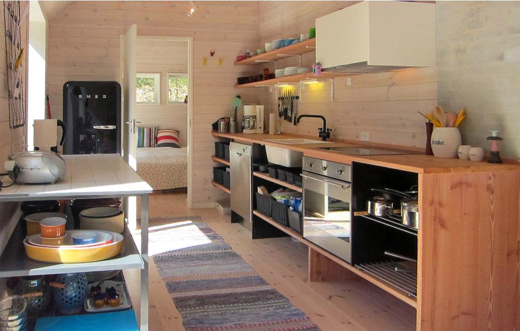Opholdsrummet har en varm og dejlig atmosfære med den lyse farve fra loftet og trægulvet. Her kan I hygge jer med madlavningen i det åbne køkken, mens ilden buldrer i den flotte integrerede pejs, og børnene spiller kort ved bordet.