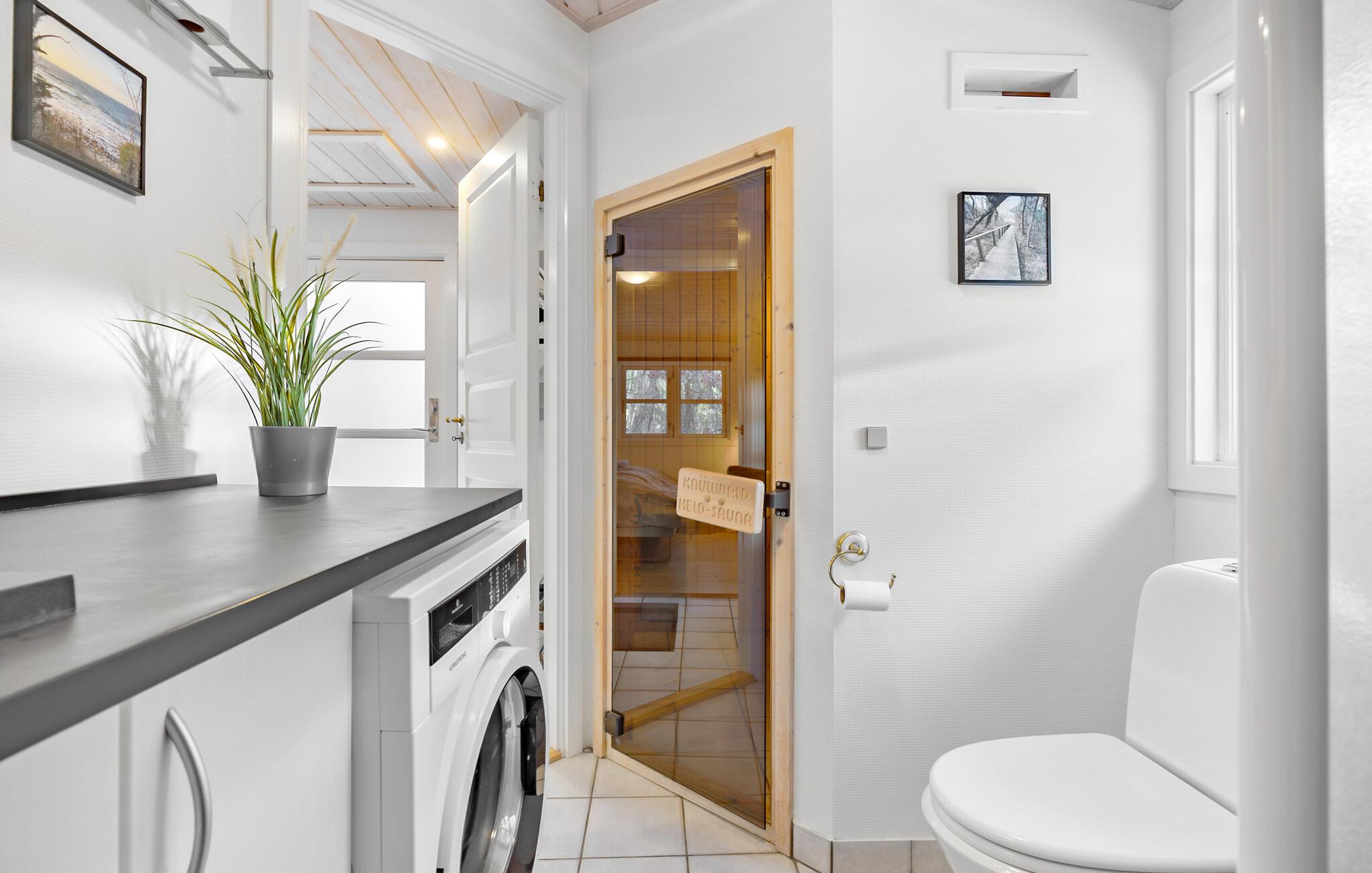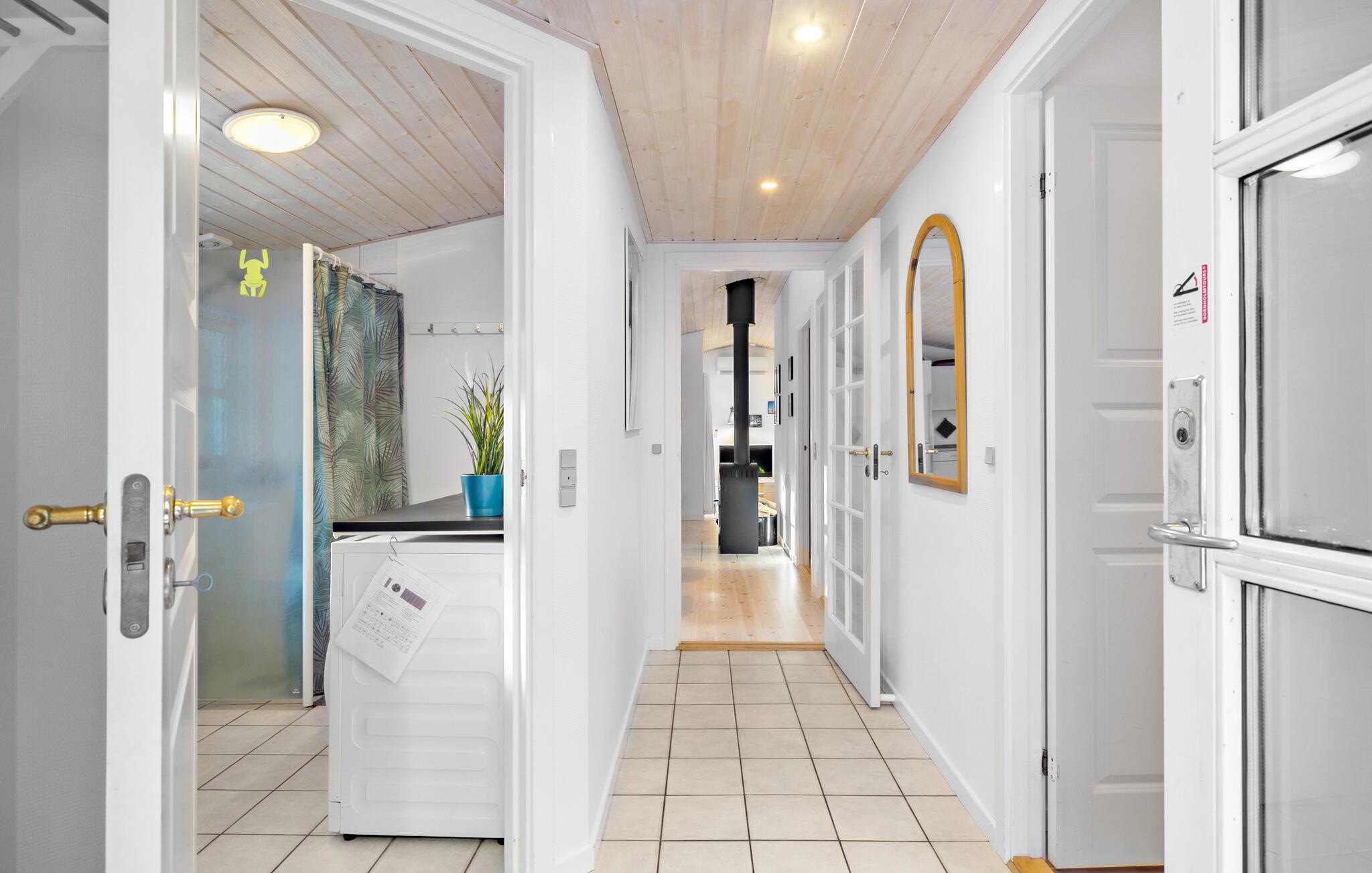 I husets nydelige opholdsstue kan I se film, høre radio eller musik, spille kort og bare hyggesnakke. Huset har et stort, lyst og dejligt åbent køkken med spiseplads ved siden af en brændeovn, som skaber en hyggelig atmosfære i køligere sæsoner. Husets flotte badeværelse har vaskemaskine, gulvvarme og en sauna til herlig ferieafslapning.