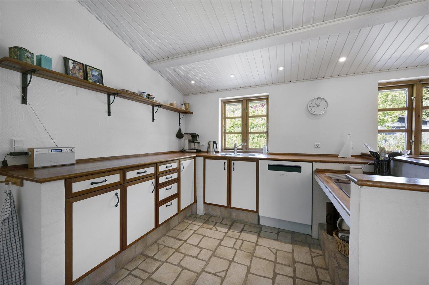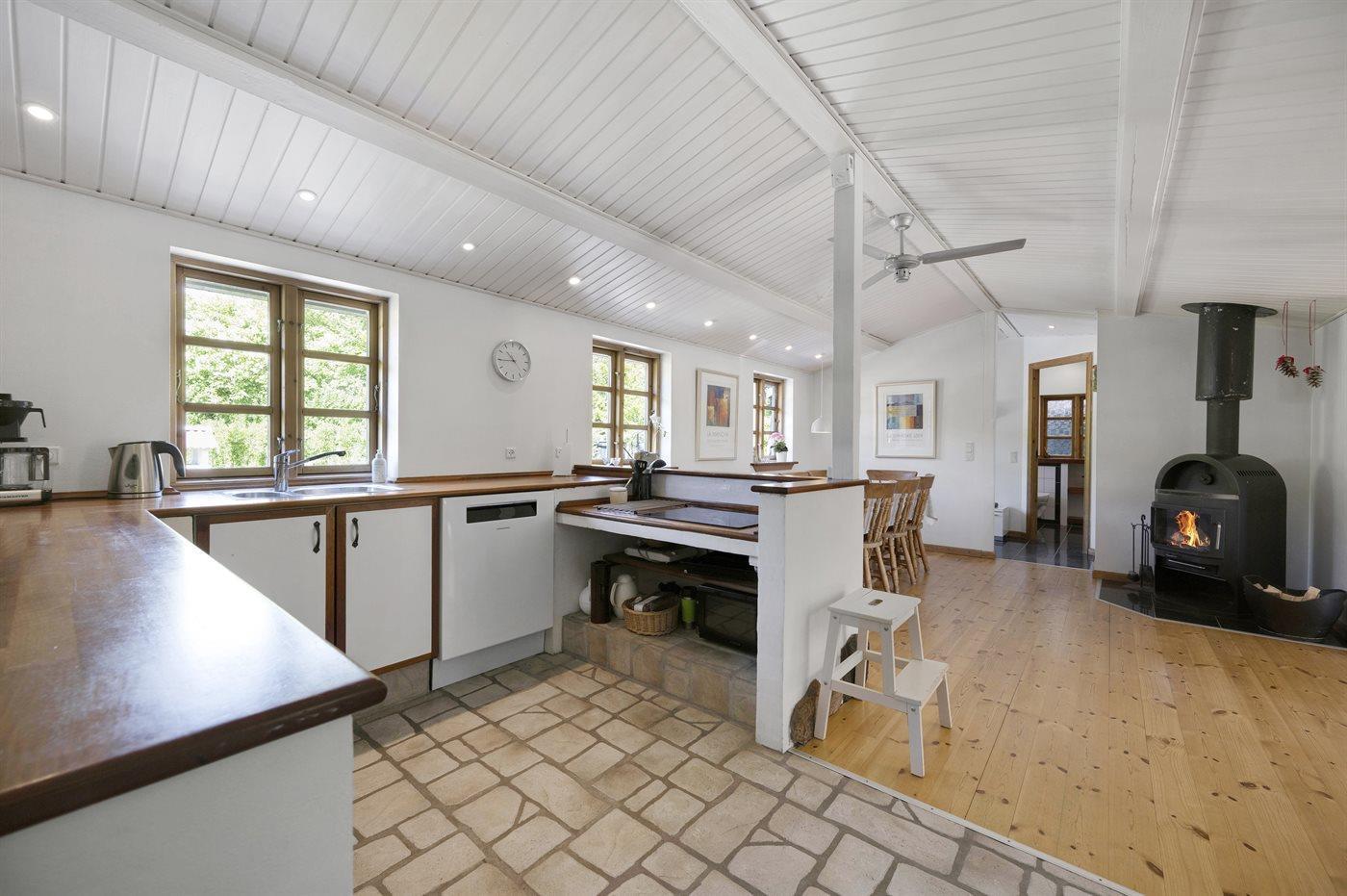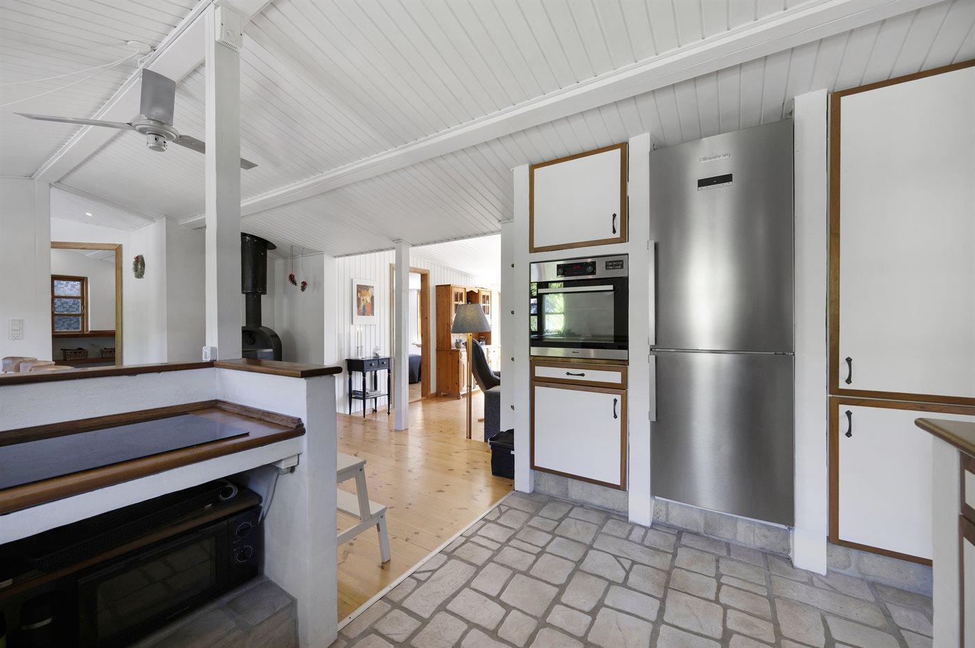 Køkkenet er udstyret med 1 køleskab. Der er 4 induktionskogeplader, varmluftovn, mikrobølgeovn samt opvaskemaskine Der er gulvvarme i køkkenet.