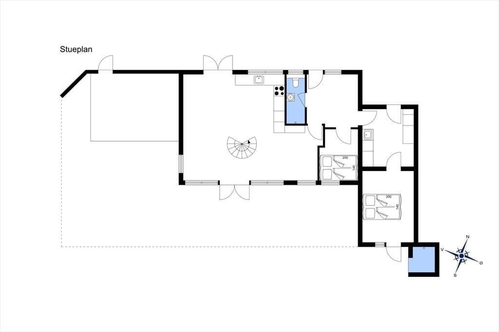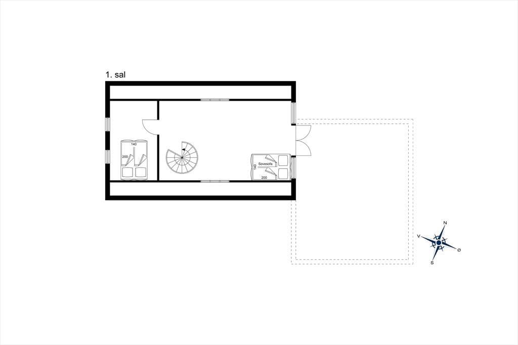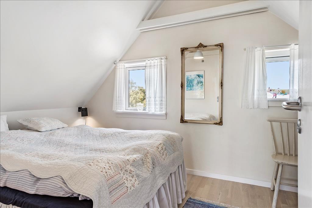 På 1. sal er et hyggeligt sofaarrangement, hvor man kan slappe af og nyde udsigten, spille et spil eller tænde for TV´et. Man kan også sætte sig til rette og fordybe sig i en bog i de store, lyse karnapper. På 1. sal er også husets 3. soveværelse med en dobbeltseng. Det er et hyggeligt og lyst indrettet soveværelse med god plads og vinduer mod vest.
