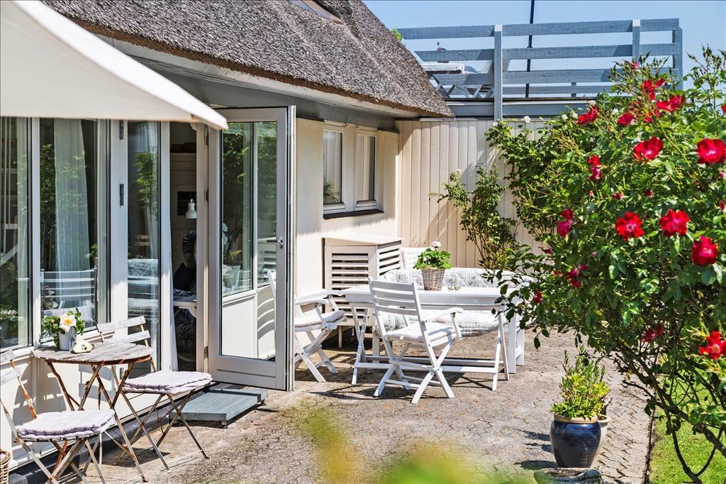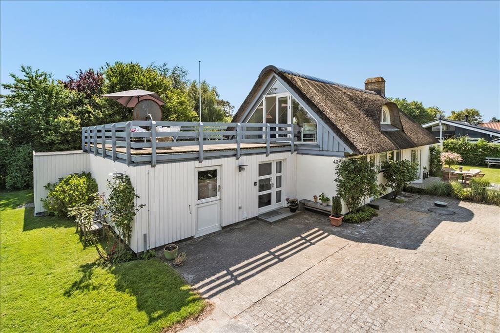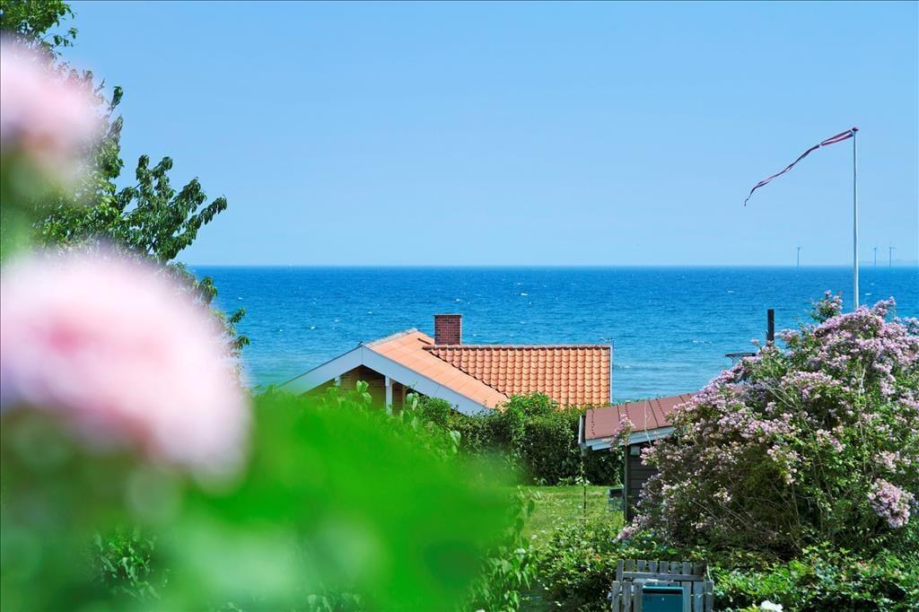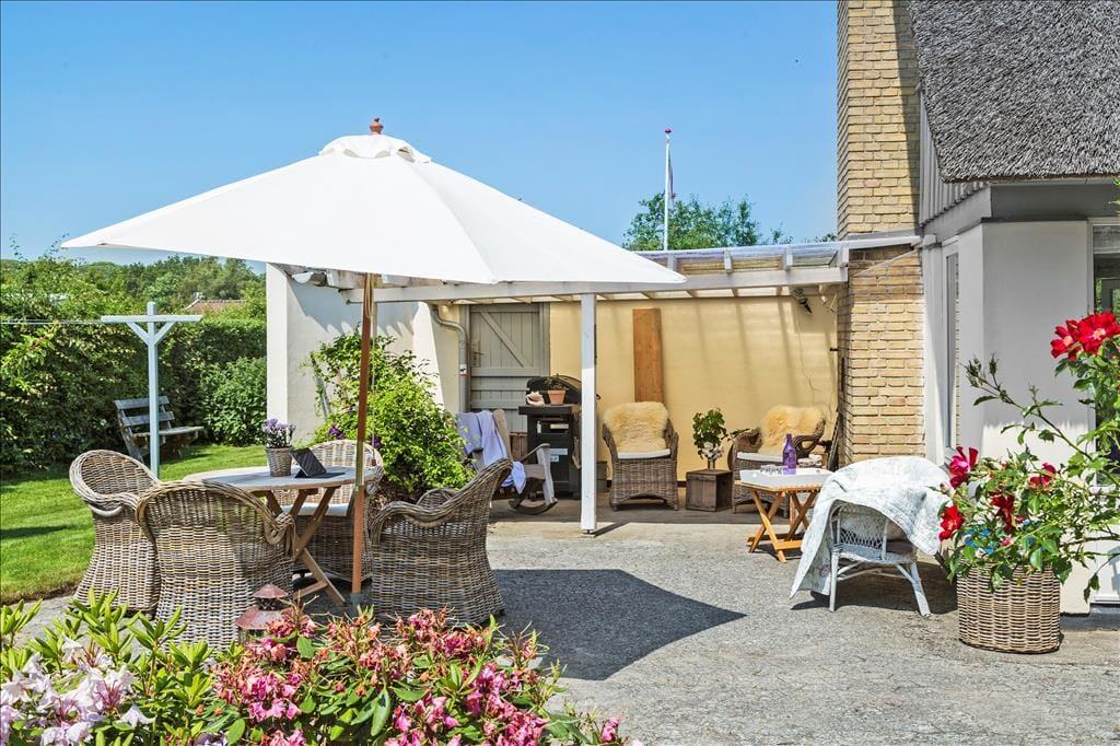 Sommerhuset ligger en anelse højt, så der på 1. salen er en fantastisk terrasse, hvorfra der er udsigt over vandet ved Dyngby Strand. På terrassen er gode havemøbler samt en parasol, så her kan man til fulde nyde sommerdagene og solopgangen. Udover terrassen på 1. sal, er der flere åbne terrasser, hvor der altid er mulighed for at finde læ. Fra køkkenalrummet er der havedør og terrasser på hver side af huset, så man kan finde den perfekte plads alt efter vejr og vind. På husets vestvendte side er også en delvist overdækket terrasse, hvor der fines flere komfortable havemøbler, liggestole og en grill. Omkring huset er en dejlig have med græsplæne. Desuden er der en udendørs bruser med v/k vand, så det er let at tage en skyller, efter man har været på stranden.