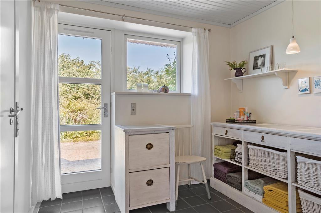 Huset har en praktisk entre, hvor der er god opbevaringsplads samt en vaskemaskine og tørretumbler. Fra entréen er der adgang til et lyst og rummeligt soveværelse med en dobbeltseng og egen udgang til terrasse og haven. Fra entreen går man videre ind i en lys fordelingsgang med opbevaringsplads, klinker på gulvet og direkte udgang til terrasse. Herfra er der adgang til det andet soveværelse, der er mindre, men også indrettet med en dobbeltseng. Husets badeværelse er i denne del af huset, og det er af nyere dato med pæne klinker på væg og gulv.