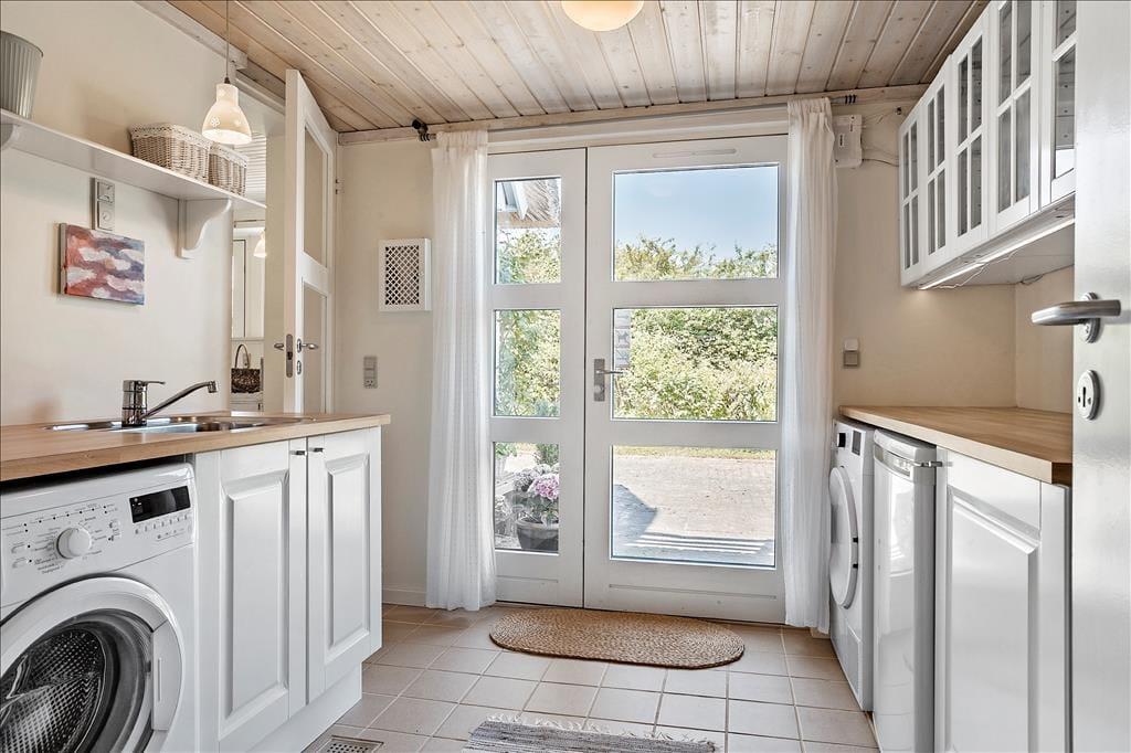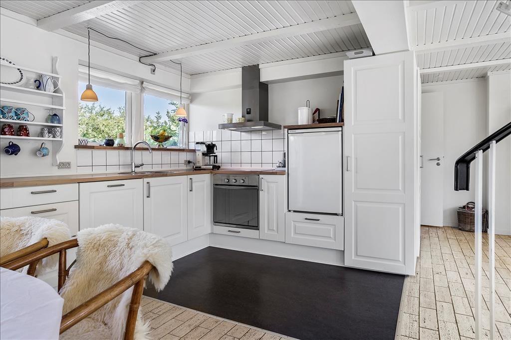 Køkkenet er lyst og funktionelt og fra vinduerne ud mod den grønne have kommer der et godt lys ind. I køkkenet er der blandt andet ovn med komfur, opvaskemaskine og kaffemaskine, så her er alt, hvad man behøver, når feriens måltider skal tilberedes.