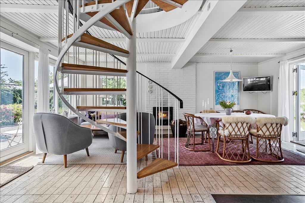 Dette lyse sommerhus i 2 etager har mange flotte detaljer og en fantastisk atmosfære. Huset indbyder til gode stunder foran brændeovnen og på terrassen med havudsigt.