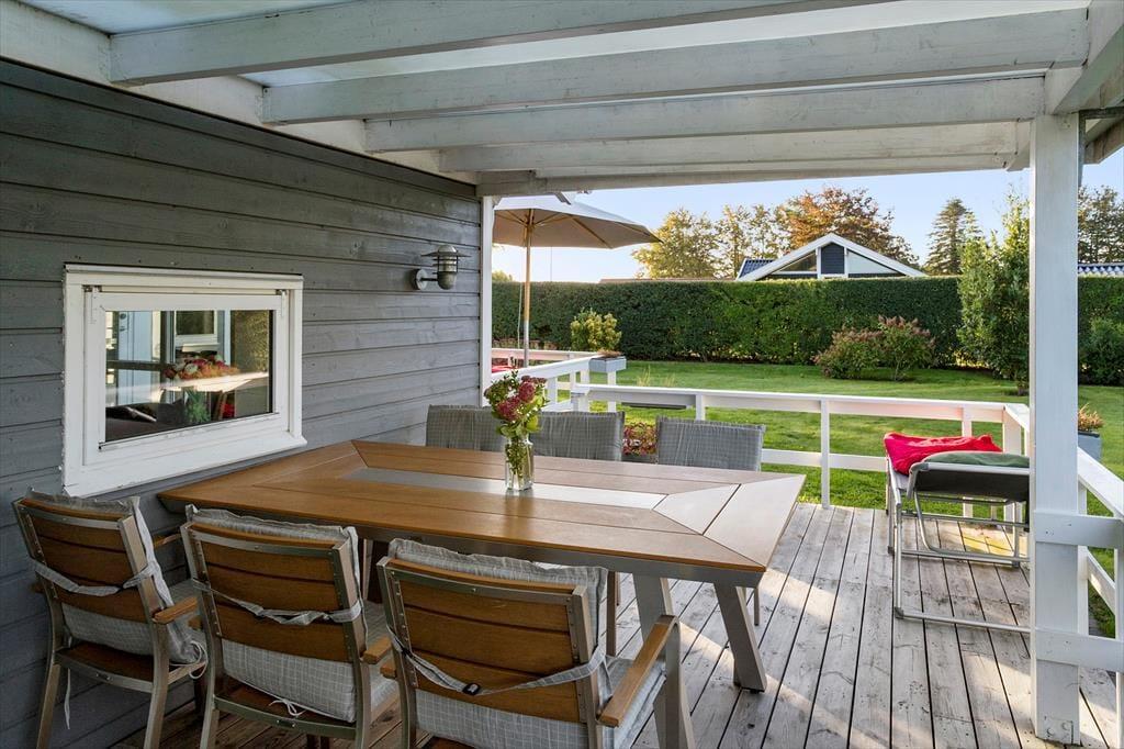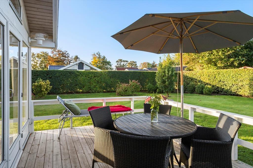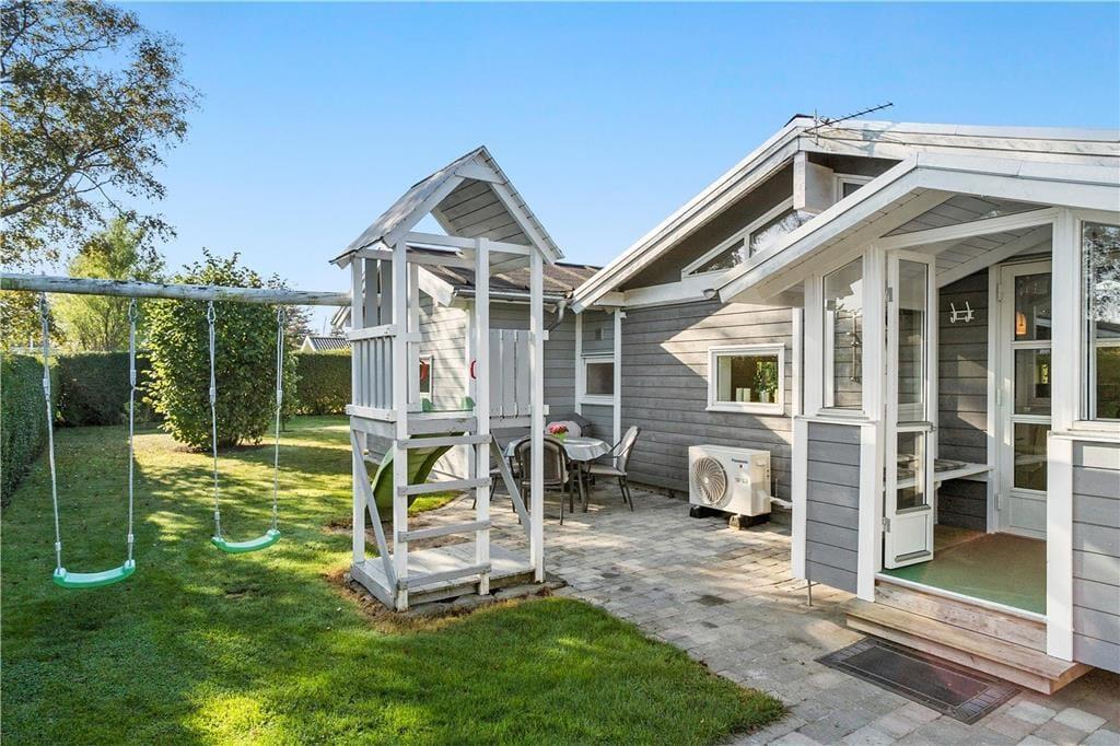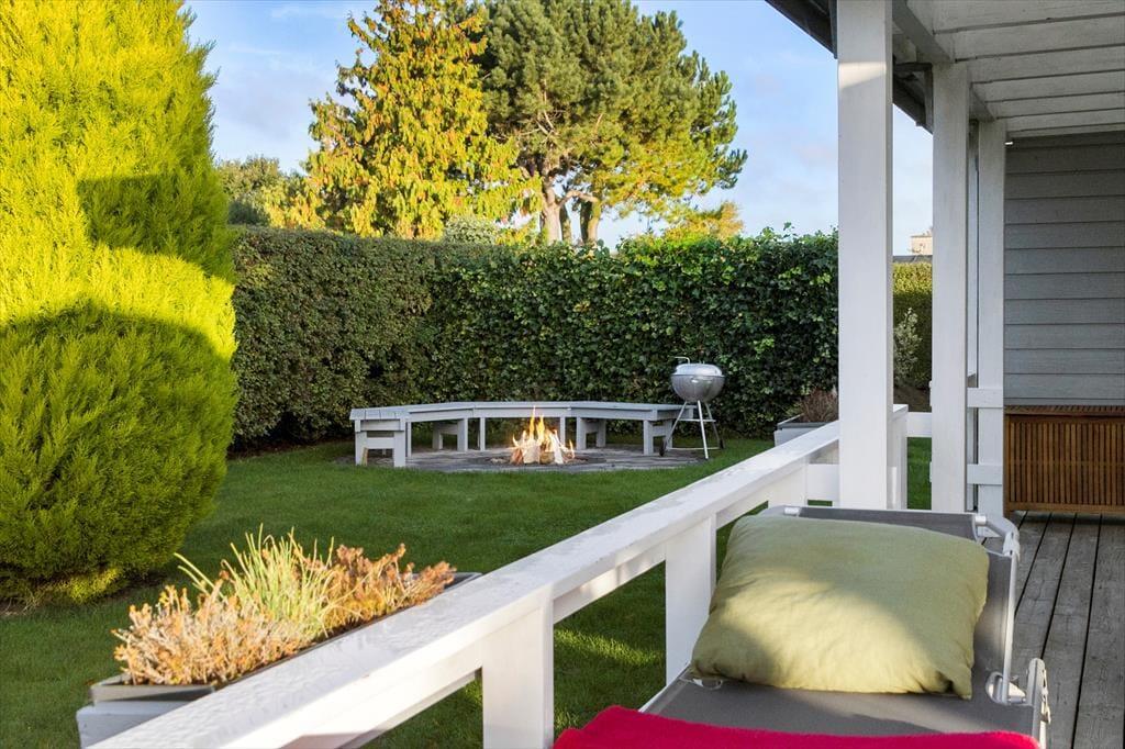 Haven er omgivet af 2 meter høj, tæt hæk og låger, hvilket gør, at ingen udefra kan kigge ind, så her kan du i fred og ro nyde din ferie. I haven er et nyt gyngestativ, legetårn og rutsjebane. Fra stuen er der udgang til en stor overdækket terrasse mod syd/vest – perfekt til en afslappende dag i skyggen eller en hyggelig grillaften. Terrassen er udstyret med havemøbler og kulgrill. Derudover er der en åben terrasse mod øst samt en udendørs bruser.
